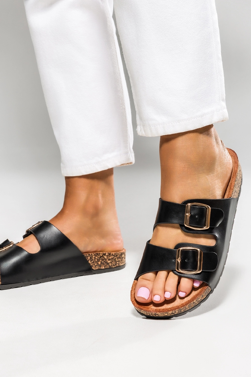 Женские шлепанцы на профилированной пробкой плоской подошвы Black h1>