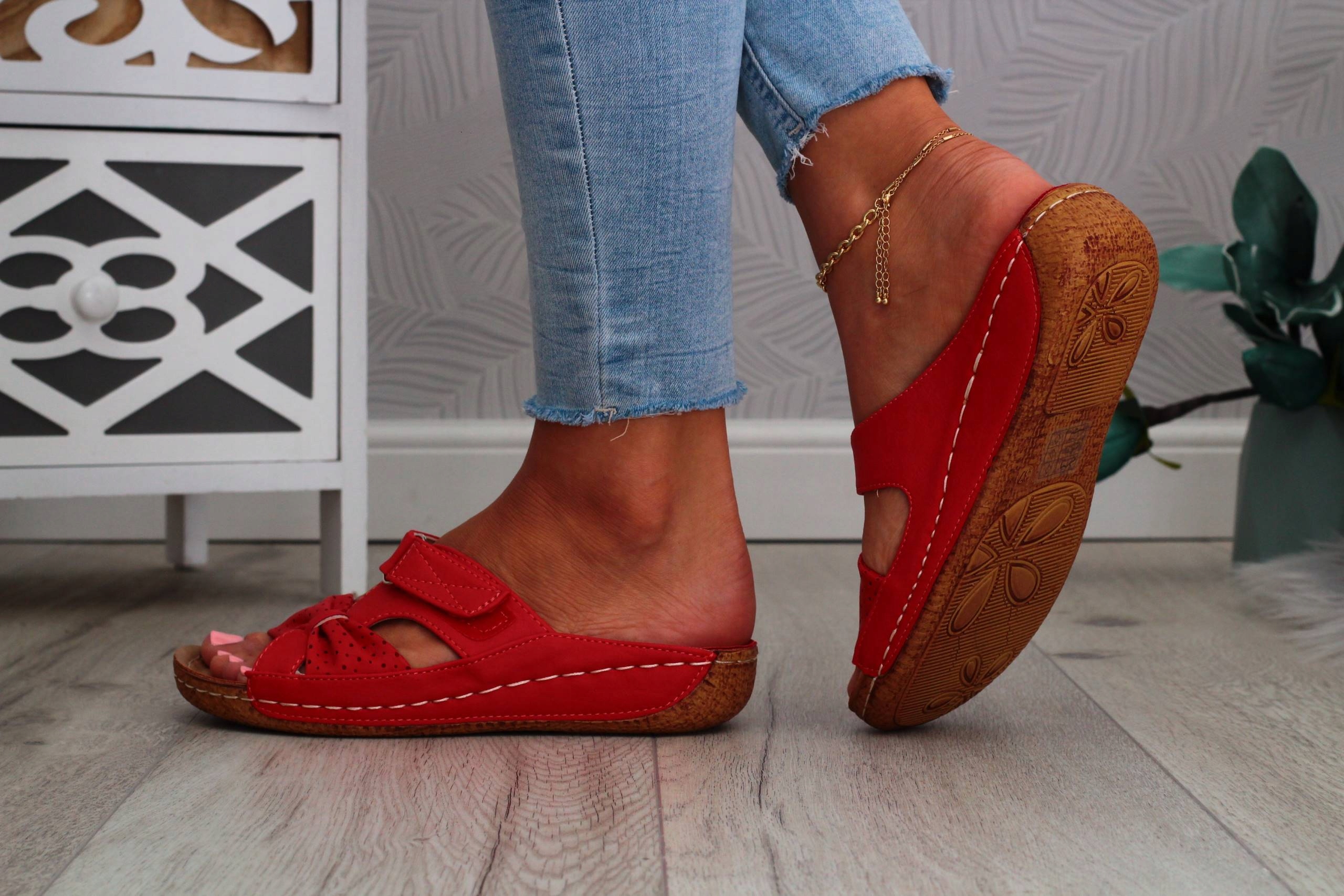 Женские красные шлепанцы на нежном клине с креплением на липучке. Профилированная вставка, сделанная из натуральной кожи. Сшитая подошва приводит к более длительной прочности. Простой вырез подходит для многих стилей.