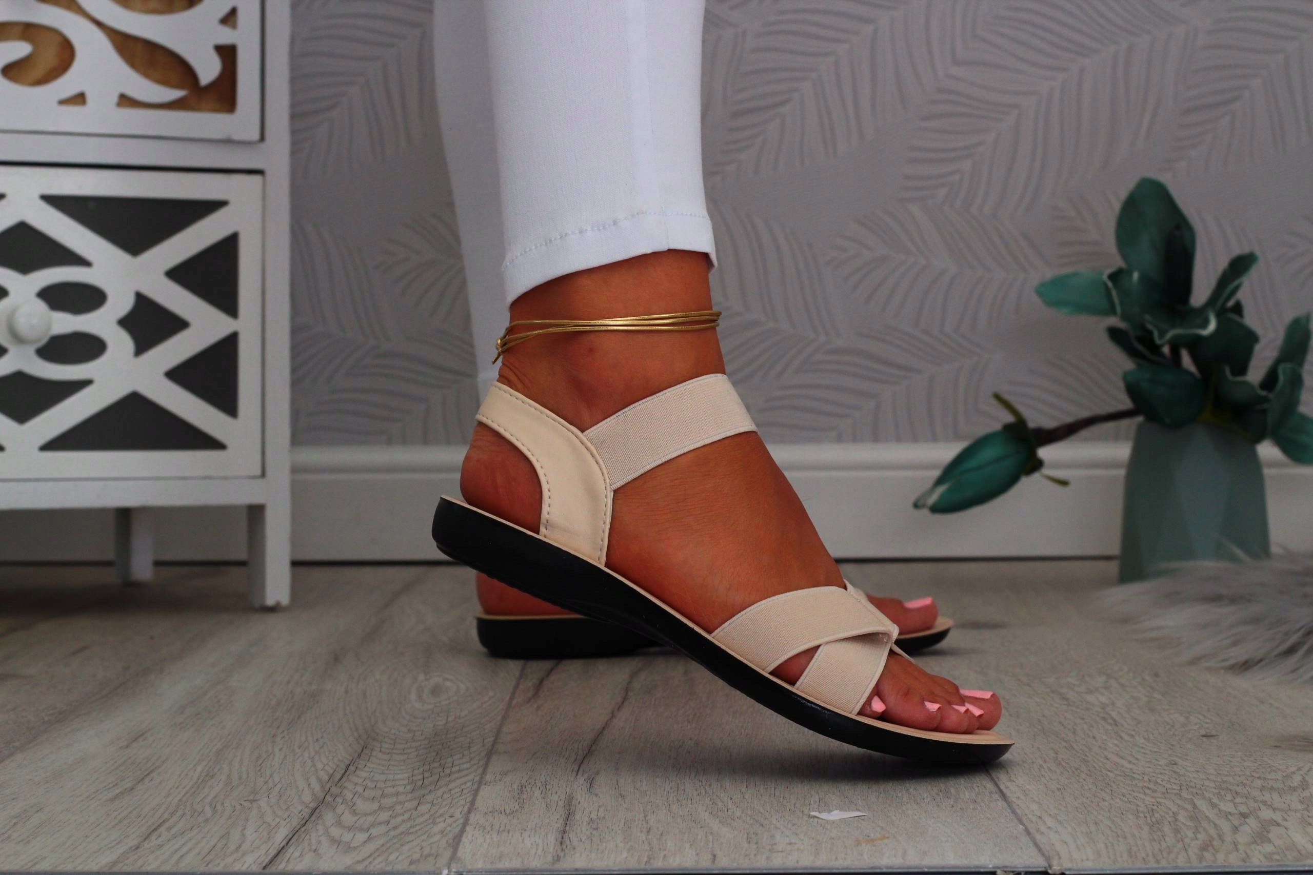 Женские босоножки бежевого цвета на плоской подошве. Они идеальны в качестве повседневной обуви в жаркие летние дни. Простой дизайн также подойдет к элегантному стилю. Эластичный ремешок на щиколотке облегчает надевание обуви и помогает подогнать ее по ноге.