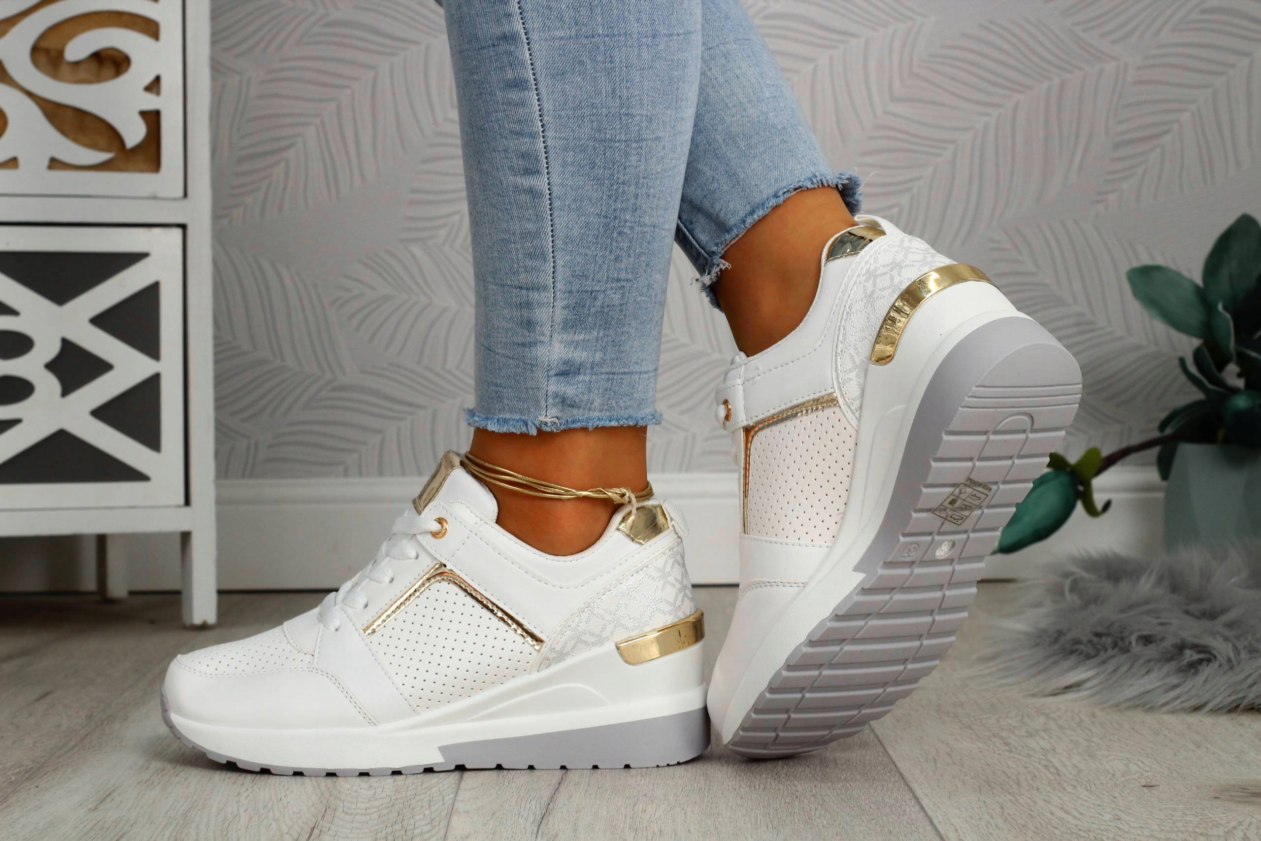 Белые женские туфли на танкетке со шнуровкой. Изготовлен из материалов хорошего качества. Они идеальны в качестве повседневной обуви. Они легкие и обеспечивают удобство и комфорт использования. Поднятая, устойчивая подошва хорошо амортизирует ногу.