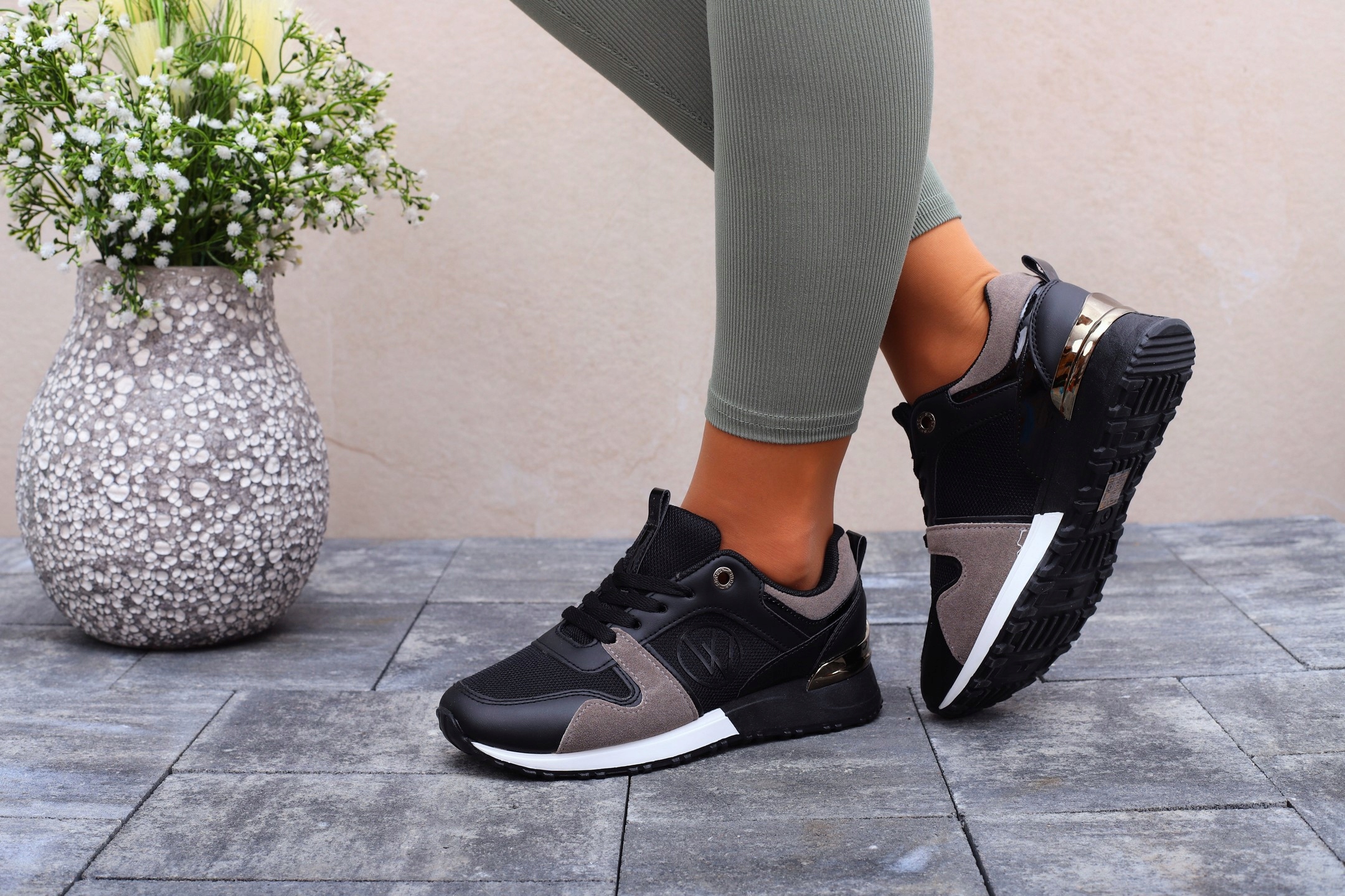 Черно-серые женские спортивные туфли на шнуровке с декоративными сетчатыми элементами. Изготовлен из материалов хорошего качества. Они подойдут как повседневная, так и спортивная обувь. Они идеально подходят для занятий в тренажерном зале и бега. Они легкие и обеспечивают удобство и комфорт использования. Поднятая устойчивая подошва хорошо амортизирует ногу. Приглушенные цвета легко сочетаются со многими стилями.