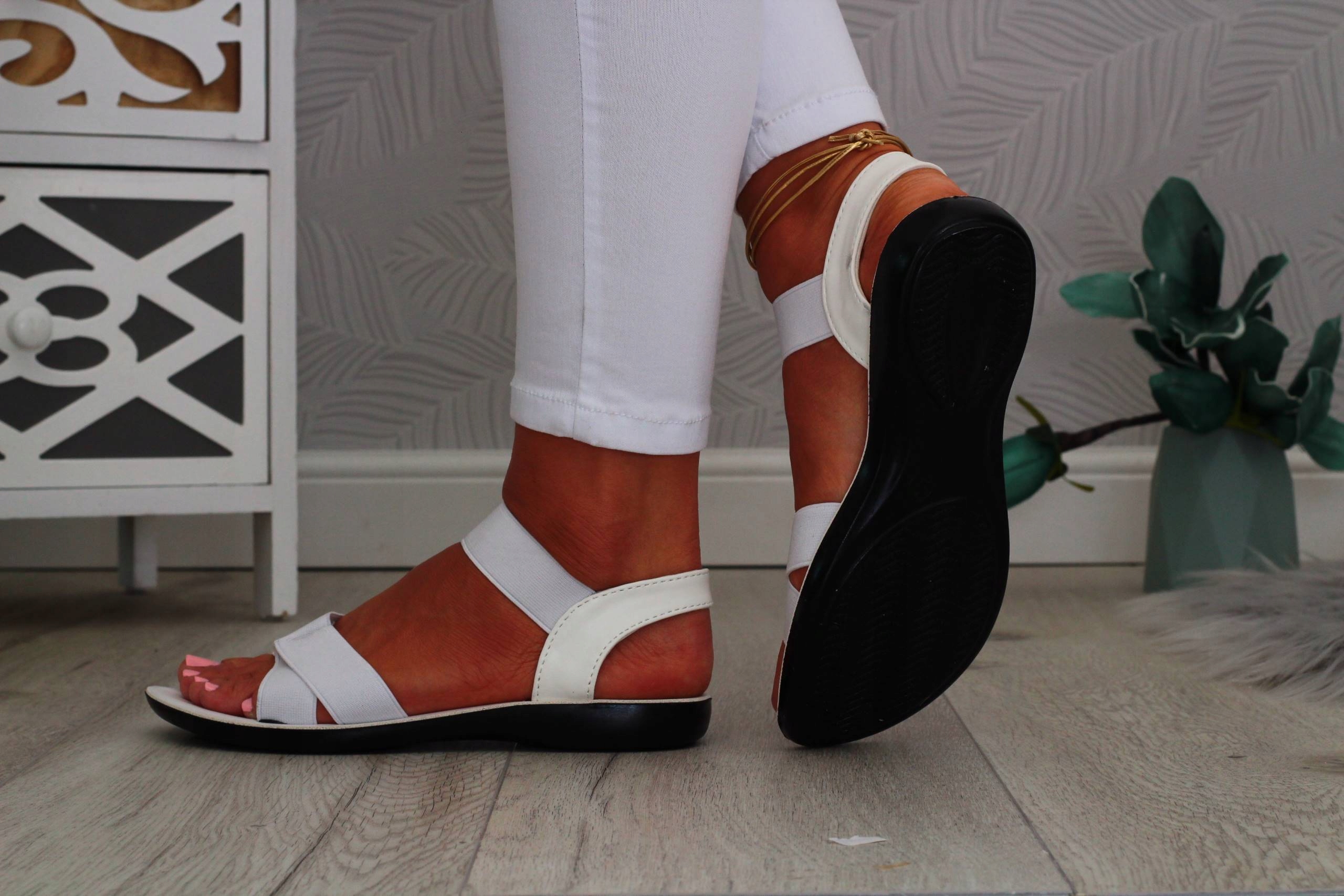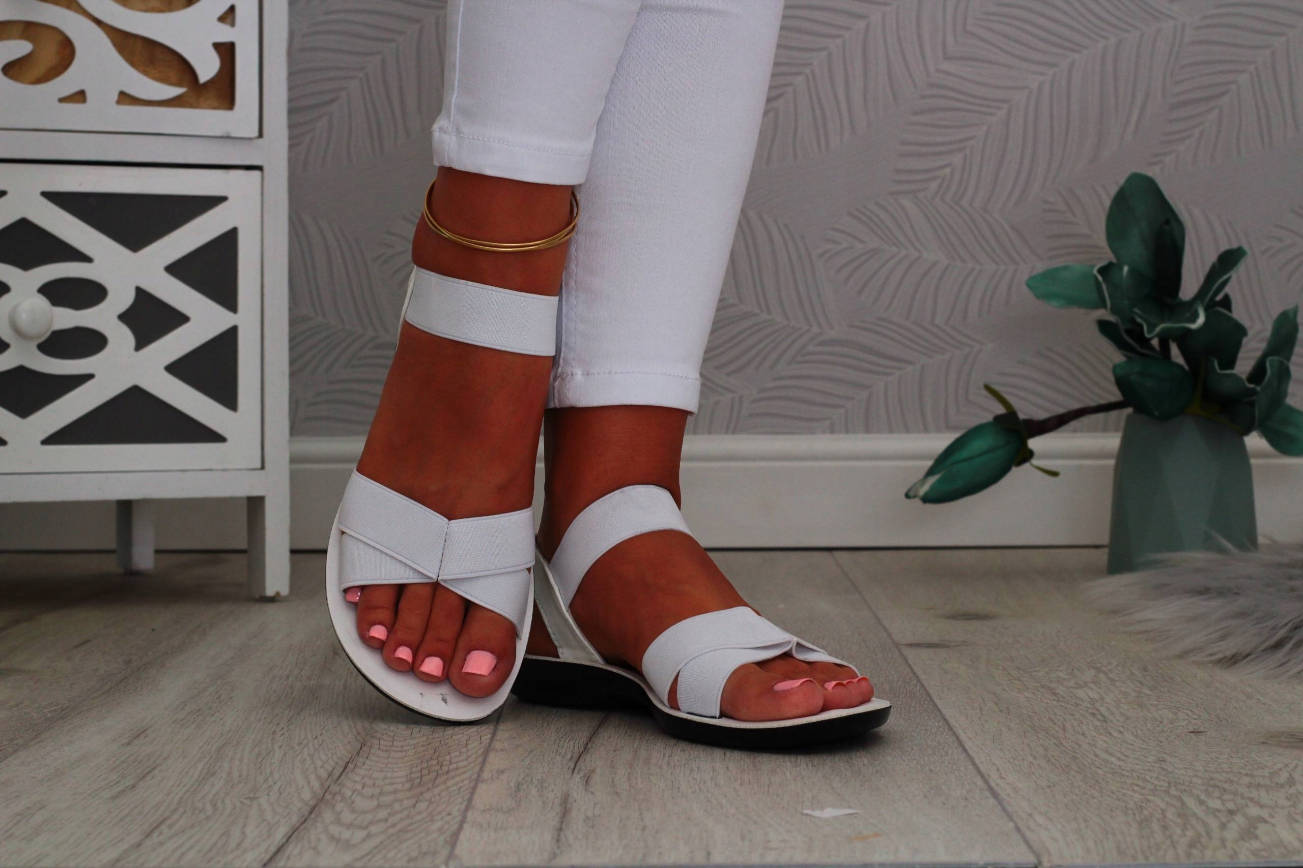 Женские белые босоножки на эластичных ремешках на плоской подошве. Их простой крой делает их идеальной повседневной обувью в жаркие летние дни и легко сочетается с более формальным стилем. Они имеют эластичный резиновый ремешок для легкого надевания и регулировки под разную ширину стопы. Профилированная стелька обеспечивает комфорт использования.