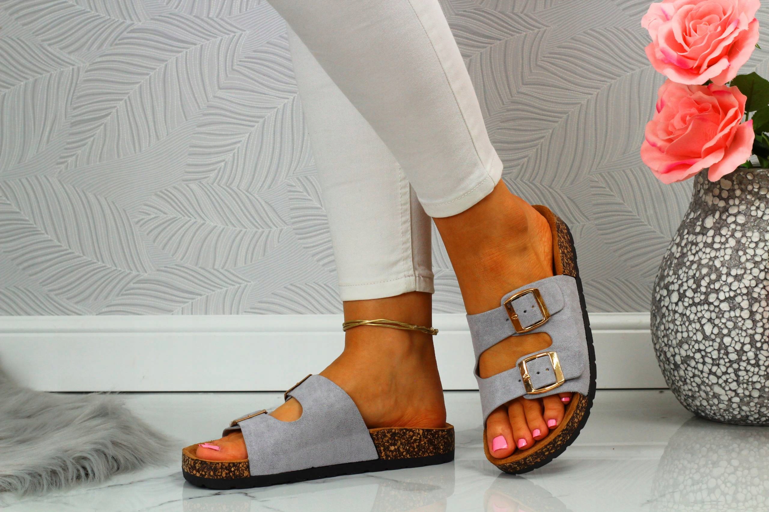 Женские шлепанцы серого цвета, застегиваются на две пряжки. Они идеальны в качестве повседневной обуви. Они подойдут для теплых весенних и жарких летних дней. Они подходят ко многим стилям. Плоская пробковая подошва и профилированная стелька обеспечивают комфорт и удобство использования. Отделка из замшевого материала.