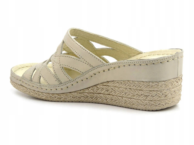 Женские шлепанцы известного польского бренда Helios Komfort изготовлены из высококачественной натуральной кожи в оттенке золота. Мягкая кожаная подкладка обеспечивает высокий комфорт ногам. Под стелькой находится мягкая SOFT губка, повышающая комфорт при ходьбе. Верх имеет оригинальный крой, образующий полосы, тонко окружающие стопу. Модель установлена на легкой плетеной танкетке с кожаным ободком. Все это легко и удобно.