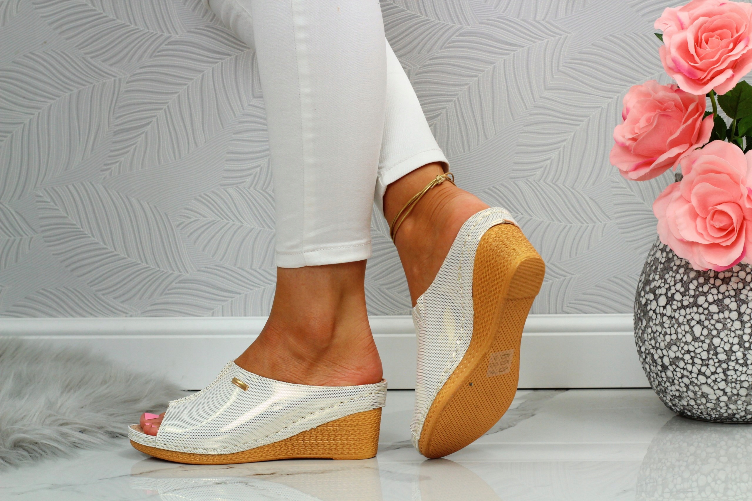 Женские шлепанцы серебристого цвета на высокой танкетке с декоративным швом на подъеме. Они идеальны в качестве повседневной обуви. Они также легко сочетаются с элегантным стилем. Профилированная кожаная стелька. Прошитая подошва продлевает срок службы обуви.