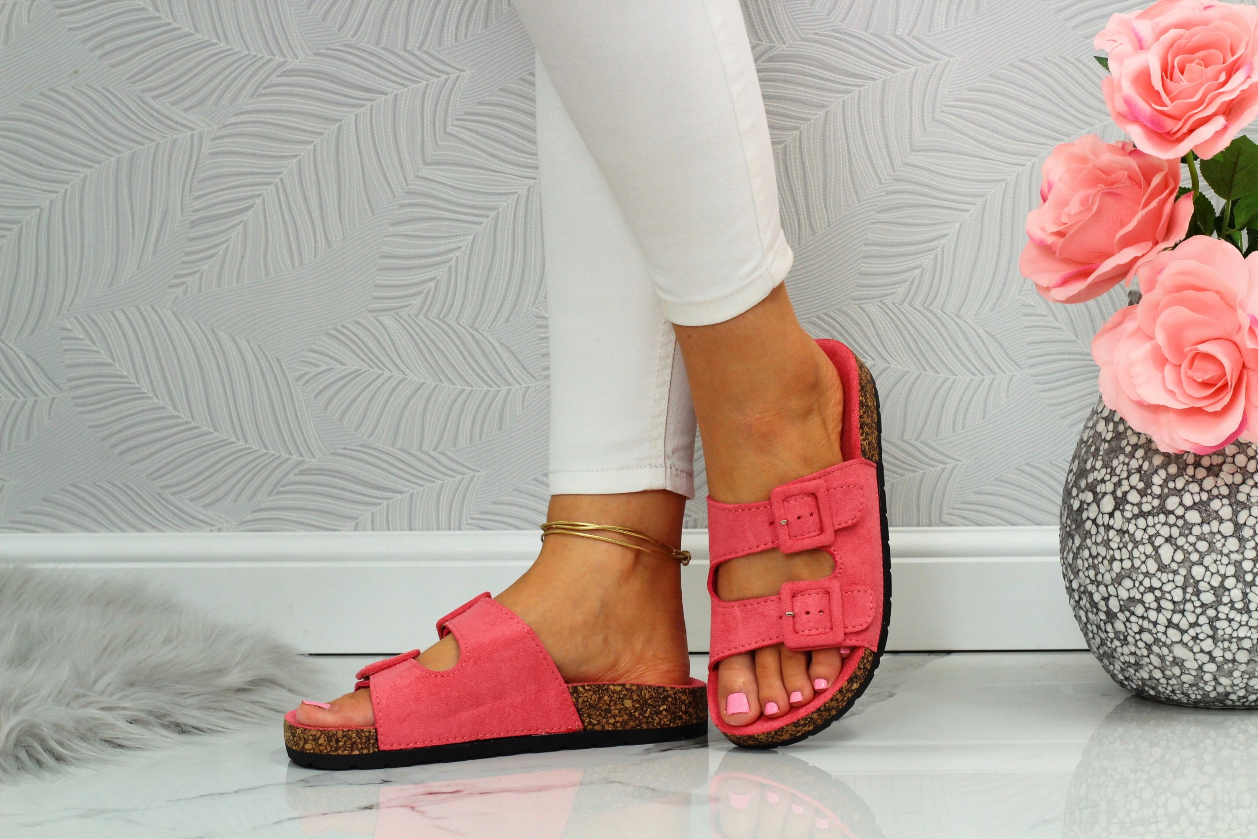 Женские шлепанцы, закрепленные двумя пряжками фуксии. Они будут идеальными, как повседневная обувь. Они будут подходить для теплых, весны и лета, жарких дней. Они соответствуют многим стилям. Плоская, пробковая подошва и профилированная вставка обеспечивают комфорт и удобство использования. Закончил с замшевым материалом.