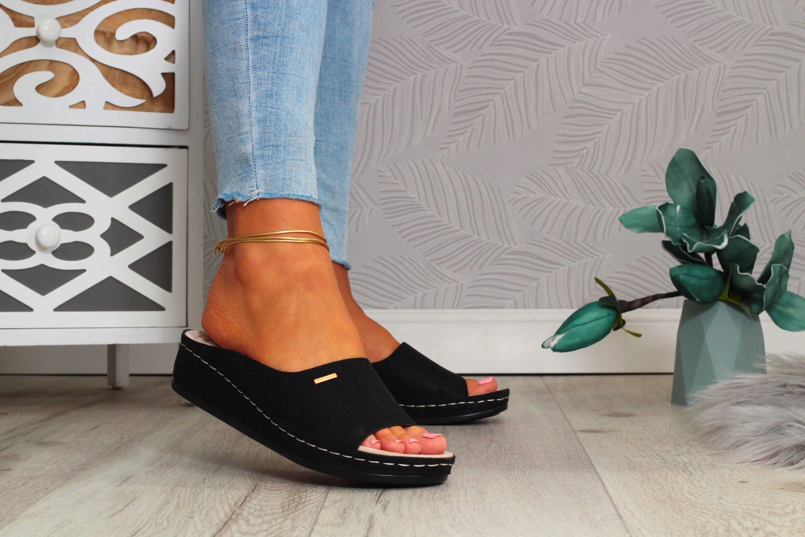 Гладкие, блестящие женские черные шлепанцы на низкой танкетке. Они идеальны в качестве повседневной обуви. Они также легко сочетаются с элегантным стилем. Профилированная кожаная стелька обеспечивает комфорт использования. Прошитая подошва продлевает срок службы обуви.