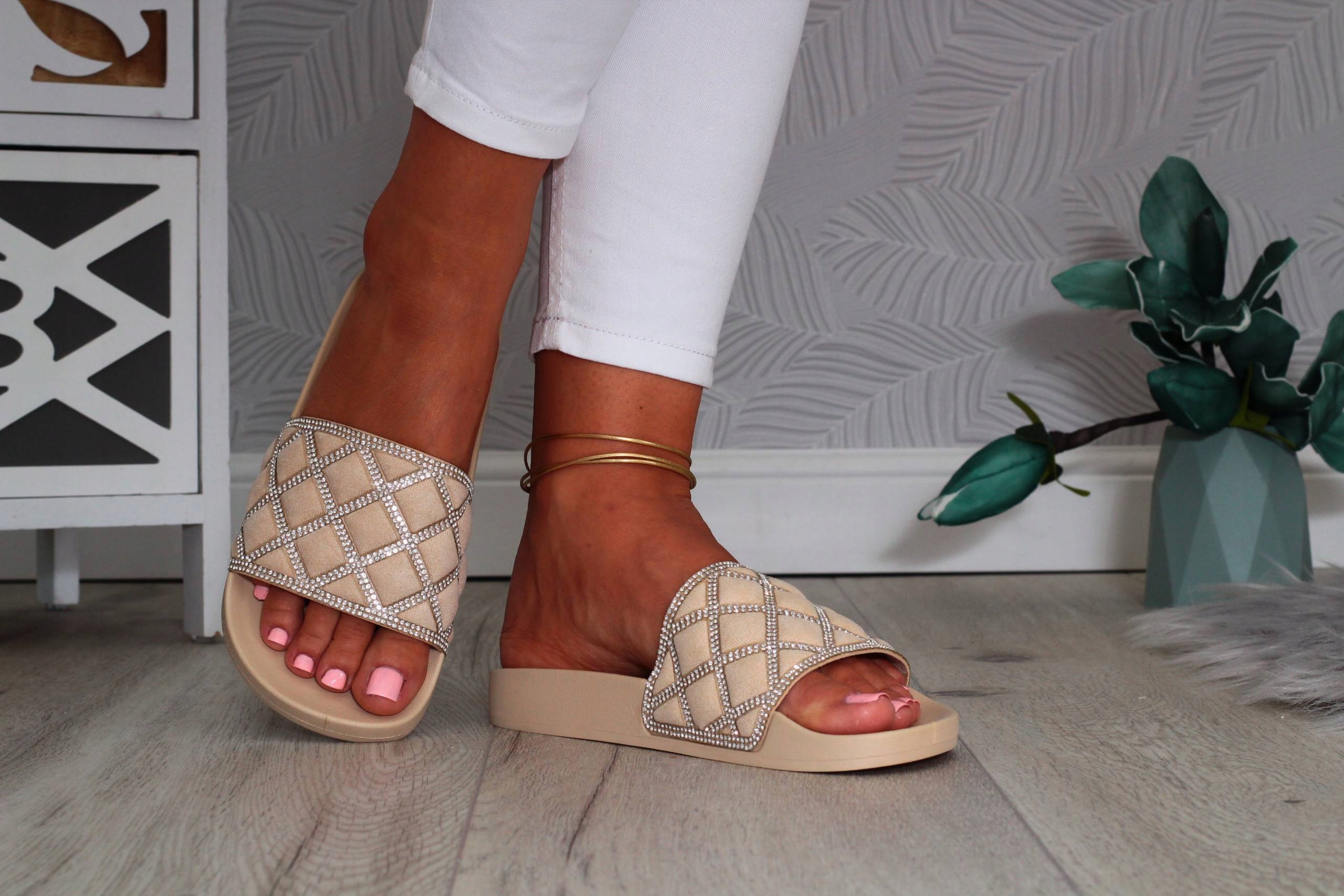 Элегантные, бежевые женские шлепанцы с декоративными кристаллами. Они идеальны как повседневная обувь, так и для особых случаев. Они подойдут для теплых весенних и жарких летних дней. Они подходят ко многим стилям. Плоская подошва обеспечивает комфорт и удобство использования.