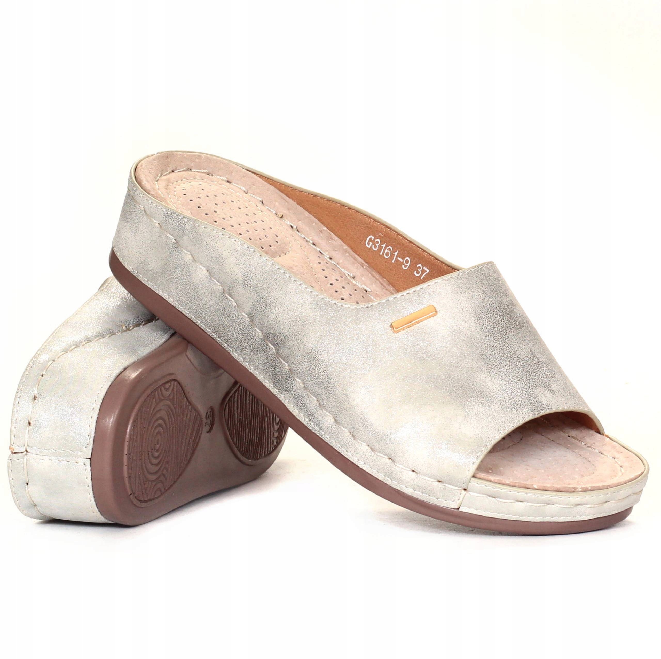 Гладкие женские серые шлепанцы на низкой танкетке. Они идеальны в качестве повседневной обуви. Они также легко сочетаются с элегантным стилем. Профилированная кожаная стелька обеспечивает комфорт использования. Прошитая подошва продлевает срок службы обуви.