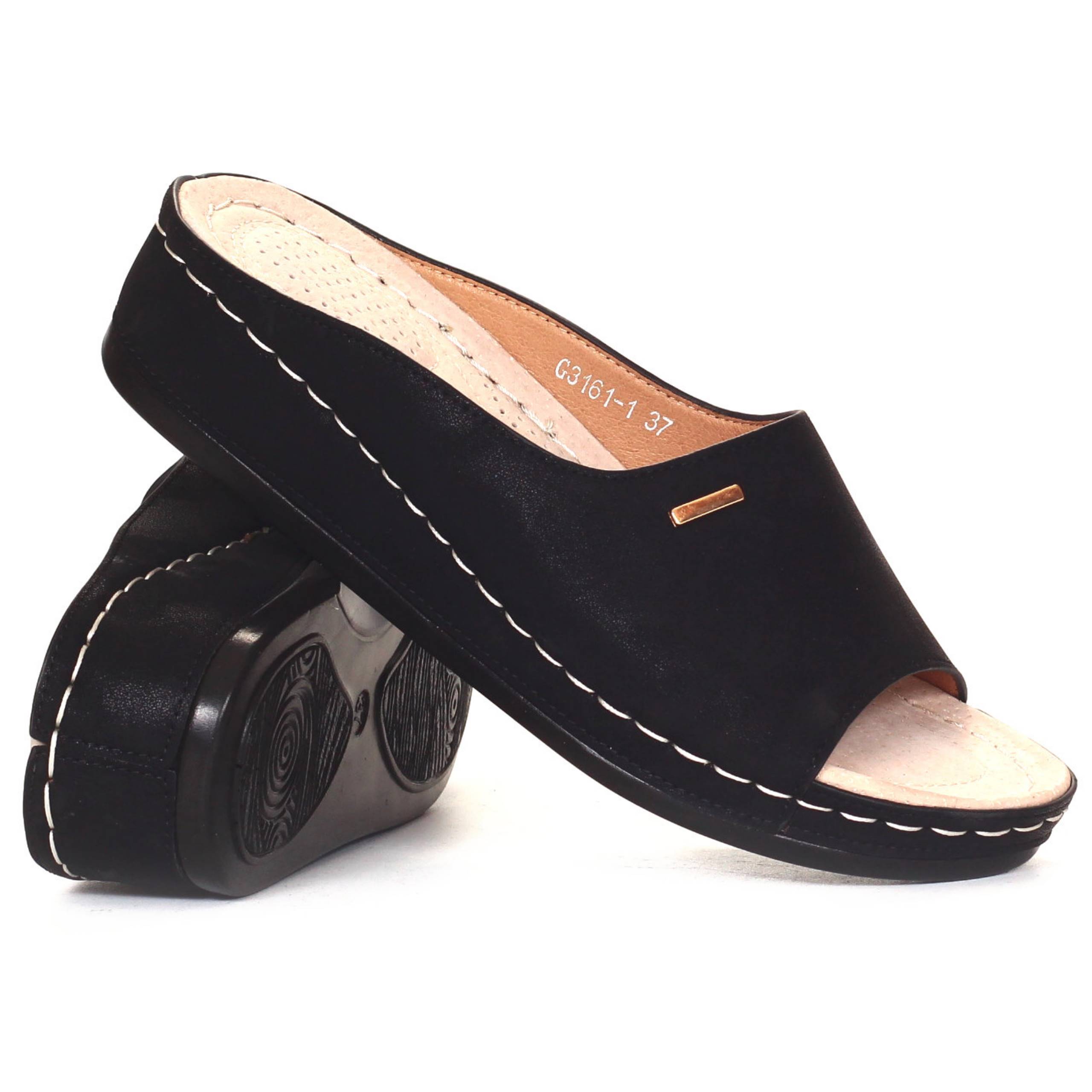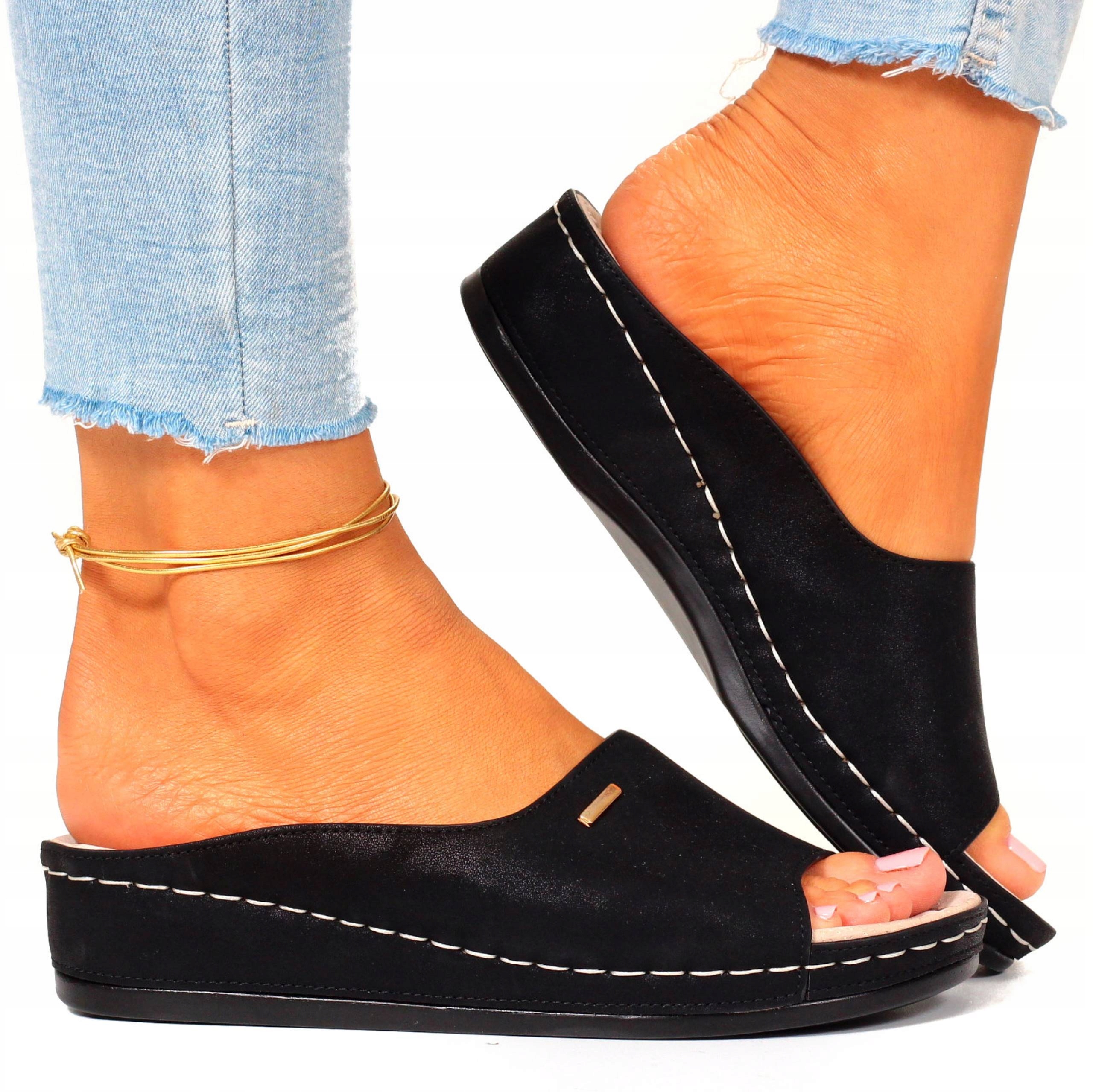Гладкие, блестящие женские черные шлепанцы на низкой танкетке. Они идеальны в качестве повседневной обуви. Они также легко сочетаются с элегантным стилем. Профилированная кожаная стелька обеспечивает комфорт использования. Прошитая подошва продлевает срок службы обуви.