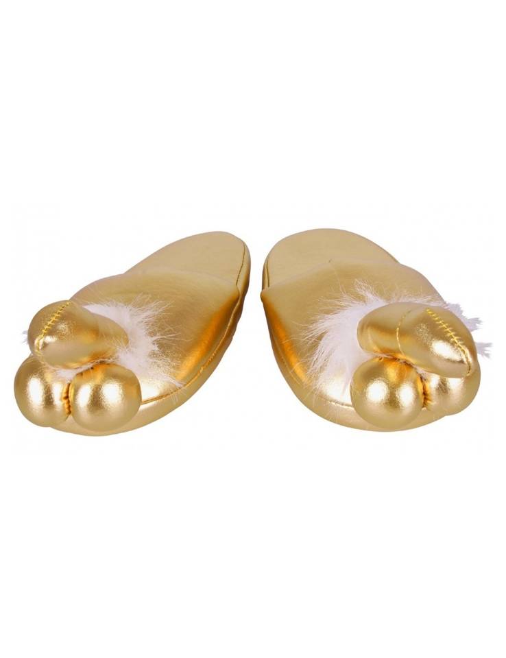 Золотые тапочки с пенисами и яичками на носке.