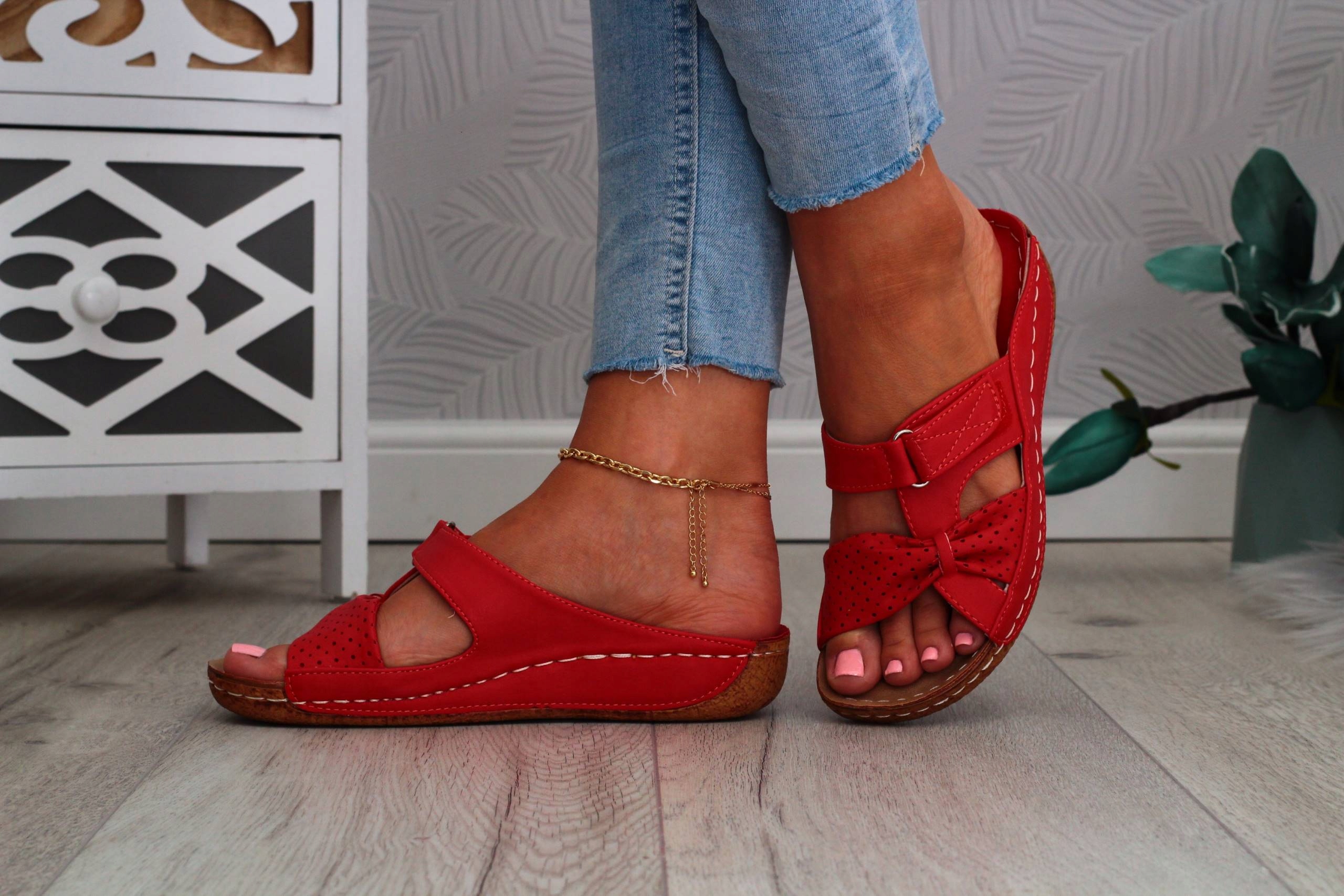 Женские красные шлепанцы на ажурной танкетке с застежкой-липучкой. Профилированная стелька из натуральной кожи. Прошитая подошва обеспечивает более длительный срок службы. Простой дизайн подходит для многих стилей.
