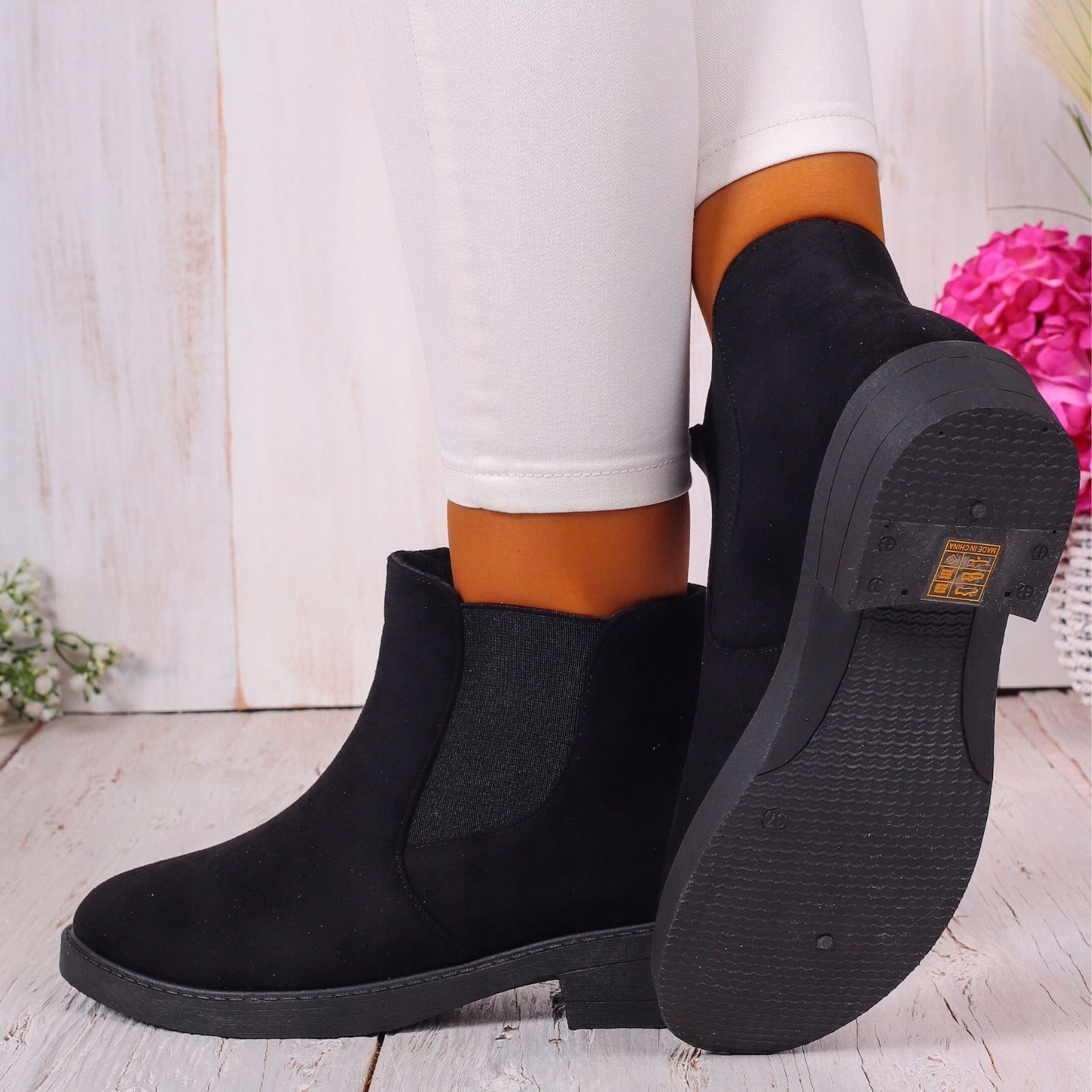 Женские, скользящие ботинки в черном. У них есть застежка на молнии, которая позволяет легко надевать. Стабильная, толстая подошва хорошо поглощает ногу. Проводится из материалов хорошего качества. Простая часть означает, что они соответствуют многим стилям.