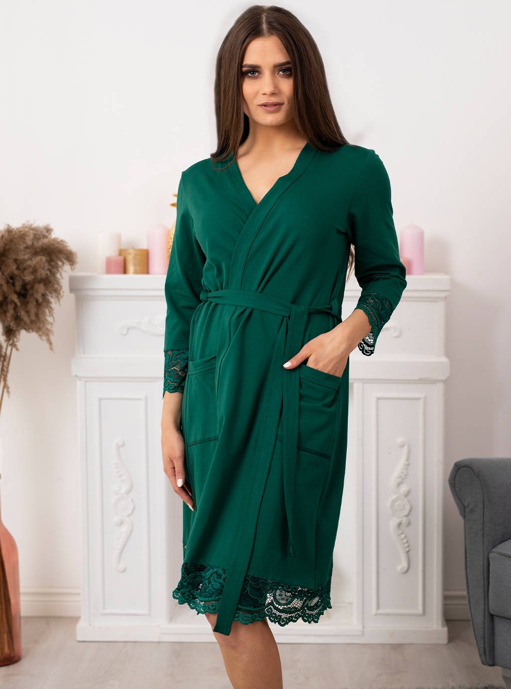 БАННЫЙ ХАЛАТ ИЗ ХЛОПКА БУТЫЛОЧНО-ЗЕЛЕНЫЙ GRACE - КРУЖЕВО