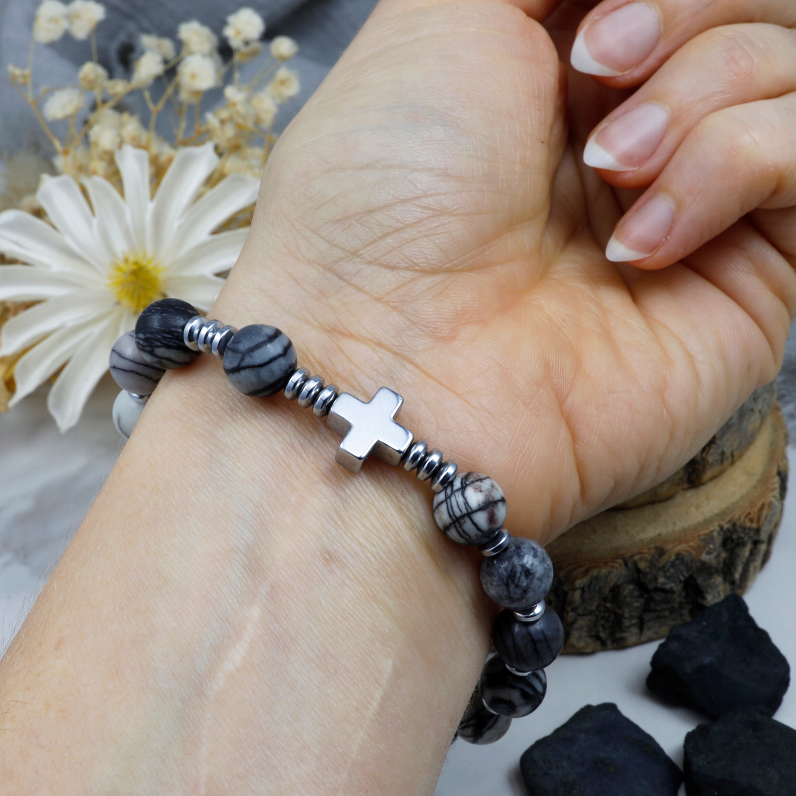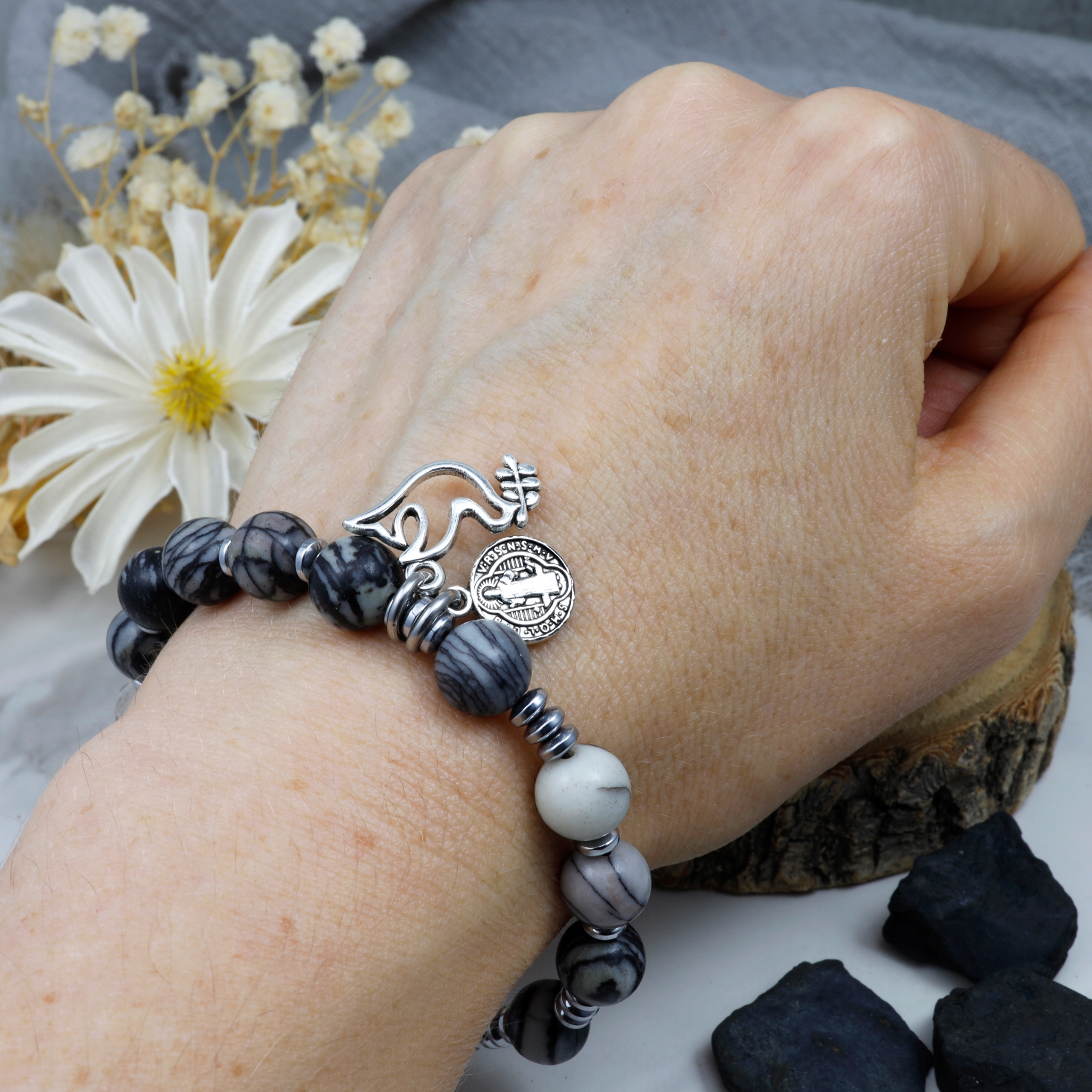 ✅ Тип и цвет камней: яшма в оттенках черного и серого и серебристый гематит