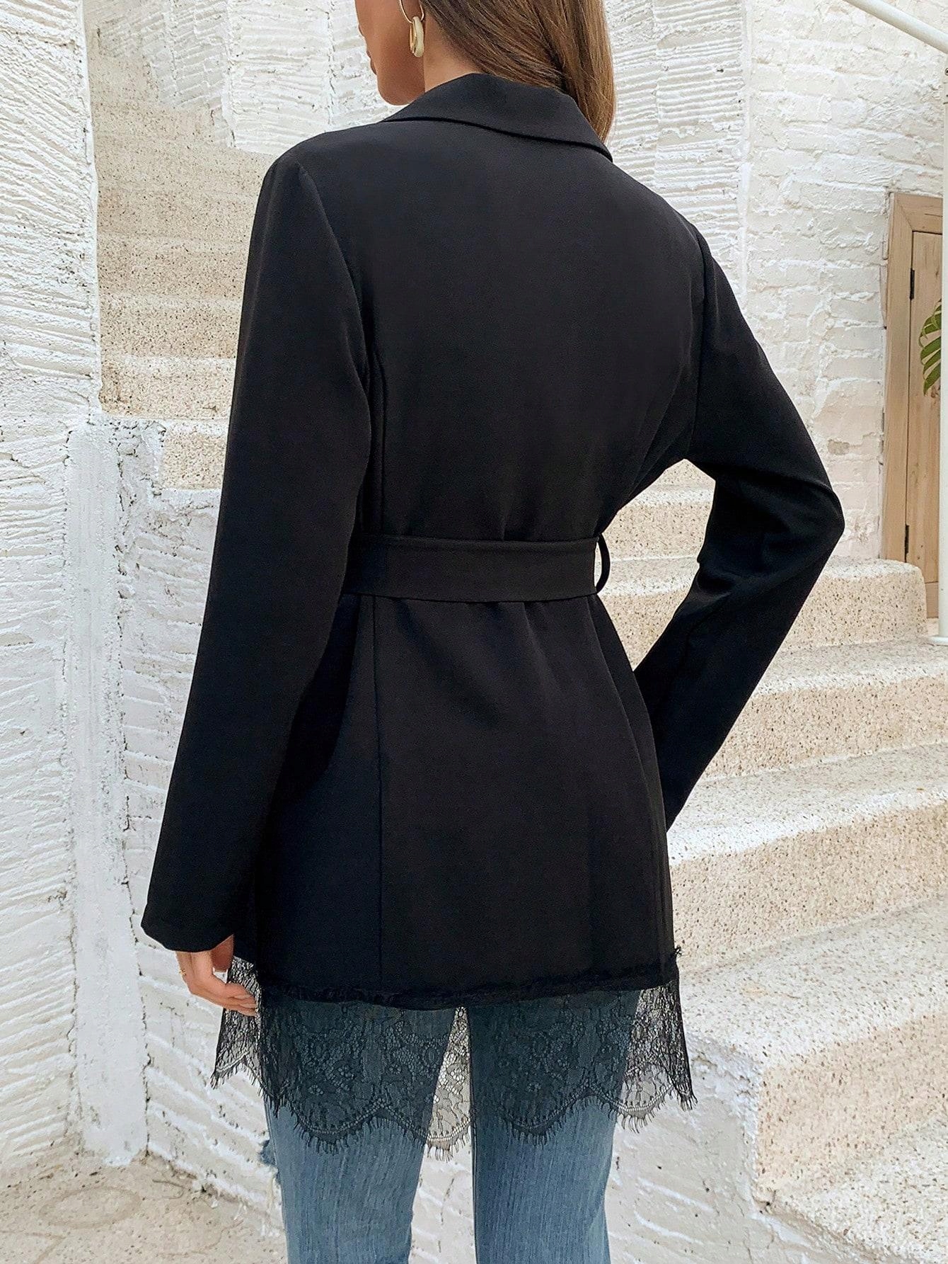 ЖЕНСКИЙ ПИДЖАК ЧЕРНЫЙ С КРУЖЕВОМ В СОЧЕТАНИИ С ПОЯСОМ ILP SHEIN L