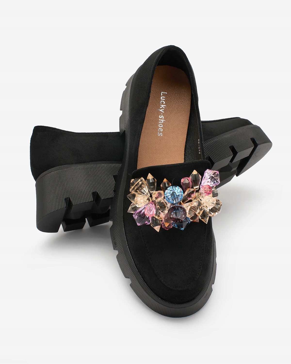 Красивые мокасины на массивной подошве — это сочетание стиля и комфорта. Нос, украшенный разноцветными кристаллами, придает им необыкновенное сияние и очарование. Верх выполнен из эко-замши, внутренняя отделка из экокожи. Они добавят блеска и элегантности вашему стилю.