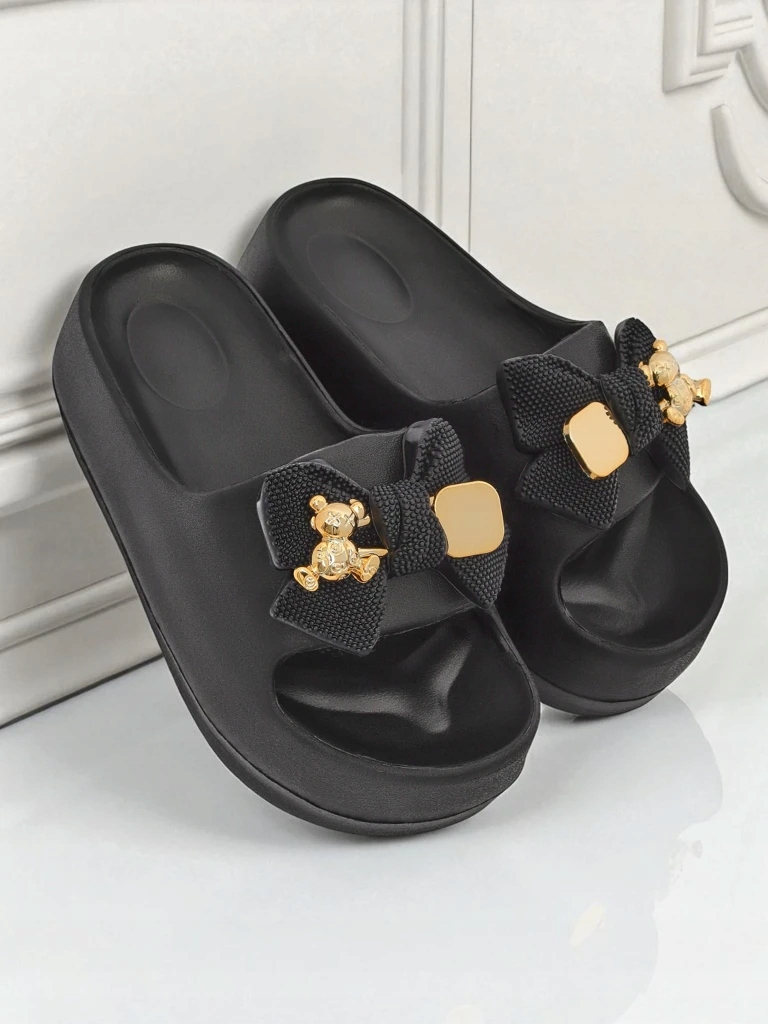 Отличные женские резиновые шлепанцы на платформе. У них есть декоративный лук на верхней части. Идеальный выбор для праздников!