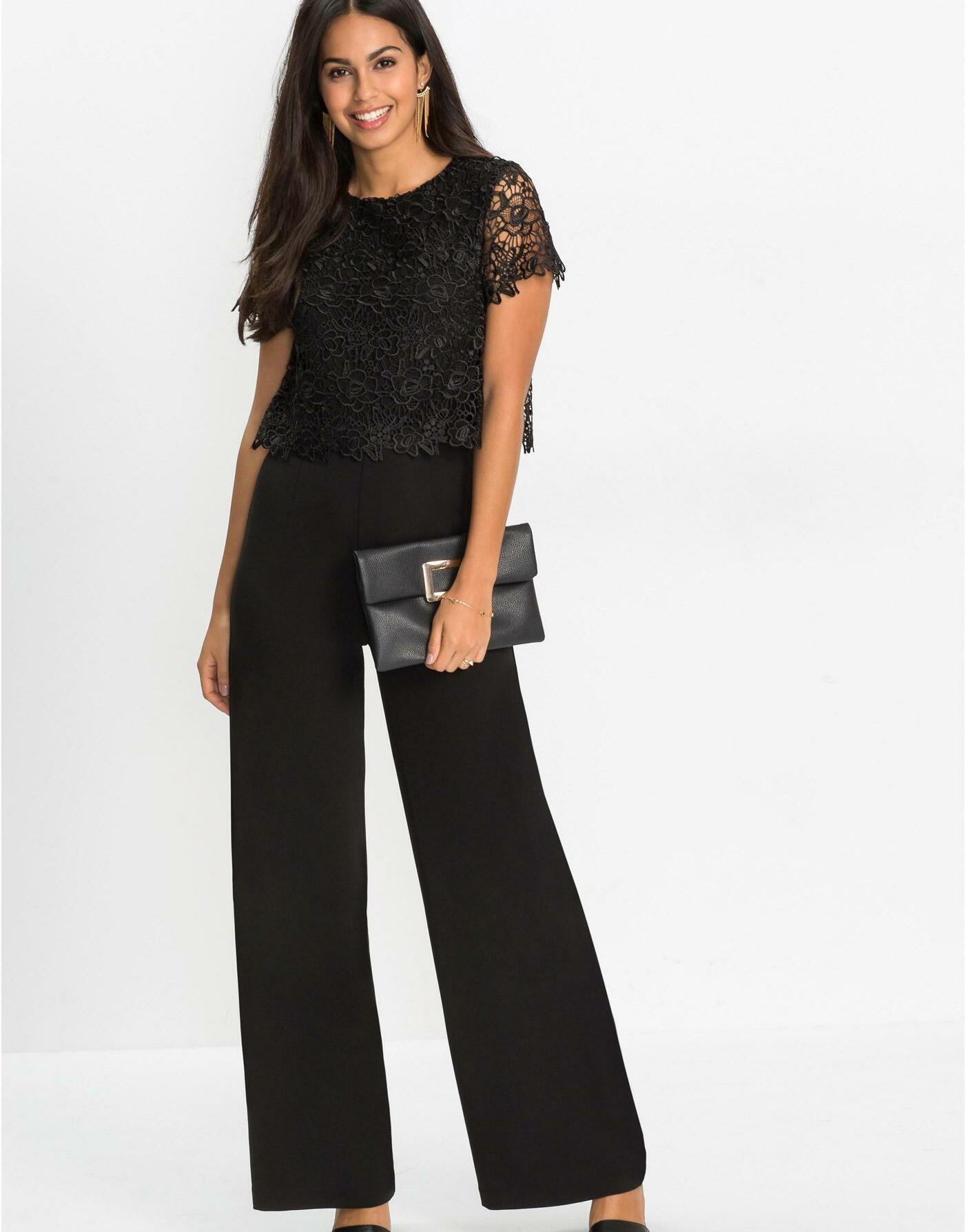 Элегантный женский комбинезон с кружевным верхом, черный – прекрасная альтернатива платью для торжественных случаев. Верх из нежного кружева добавляет женственного шарма, а приталенный низ красиво подчеркивает фигуру. Элегантный черный цвет подойдет для свадьбы, свидания или вечернего выхода.