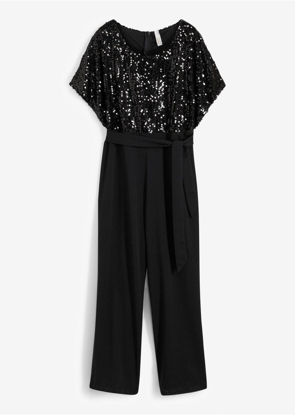 Элегантный черный женский вечерний комбинезон с пайетками – идеальный выбор для особых случаев. Эффектная отделка пайетками добавляет блеска и гламура, а приталенный крой подчеркивает фигуру, обеспечивая комфорт при ношении. Идеально подходит для вечеринок, банкетов и вечерних выходов.