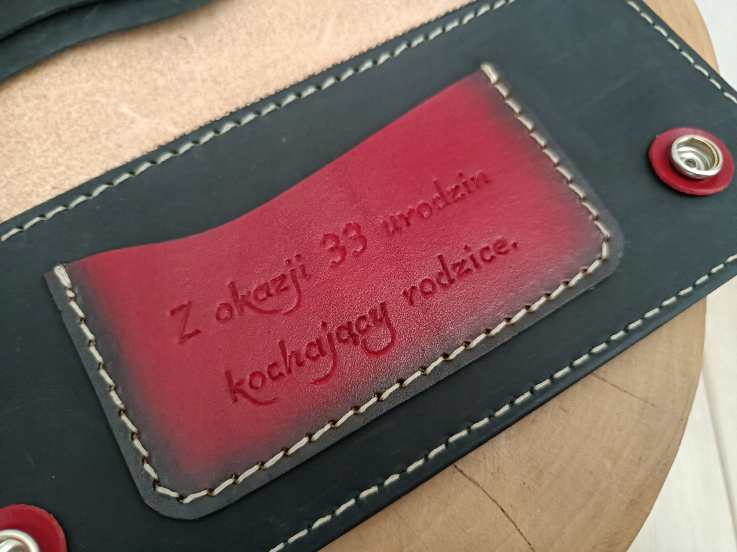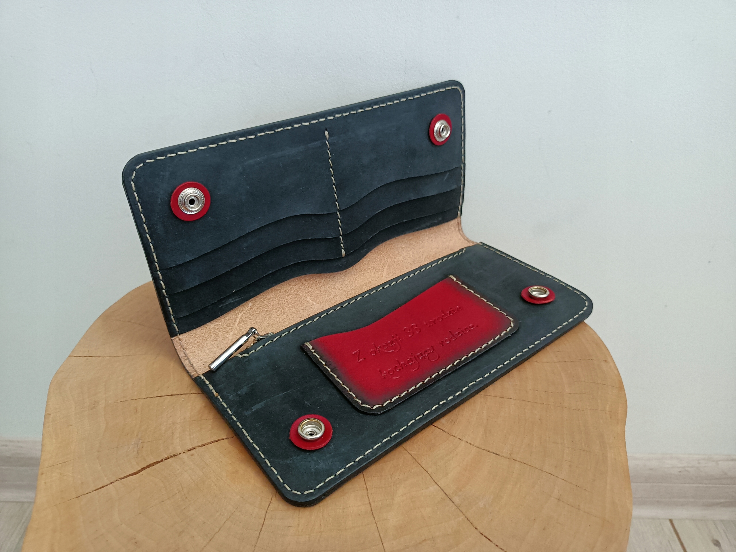 Slim Women's Wallet, изготовленный из сумасшедшей натуральной кожи сумасшедшей лошади в сочетании с кожей Jucht. Обложка украшена ручным мотивом. Он имеет два больших кармана, один карман, прикрепленный на молнии и поместите 7 карт, сшитыми с толстыми прочными резьбами. Закреплен с двумя прессами.