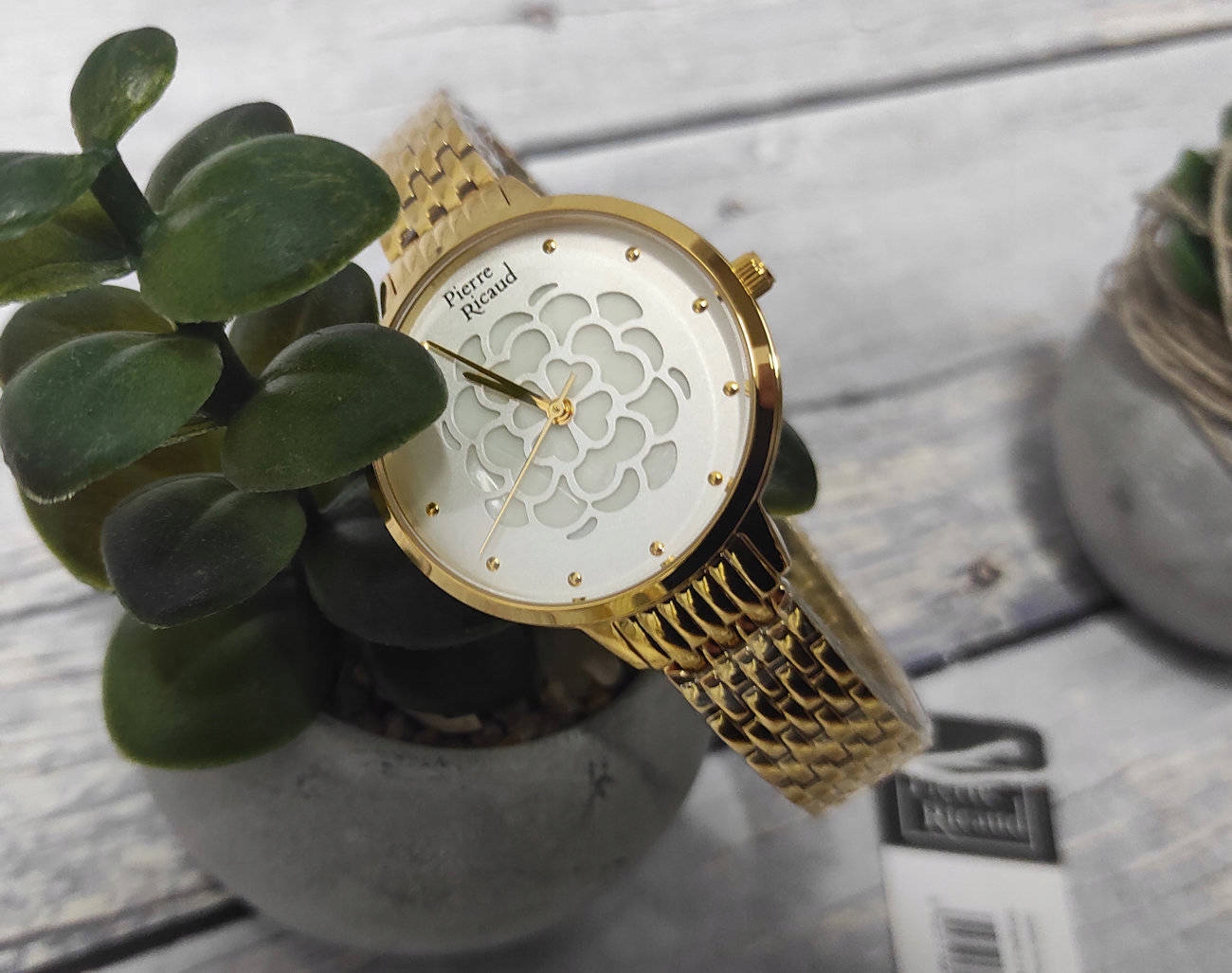 Элегантные женские золотые часы Pierre Ricaud. Корпус и браслет из стали золотистого цвета. Серебристый и светло-серый циферблат с цветочным мотивом. Класс герметичности WR. Кварцевый механизм
