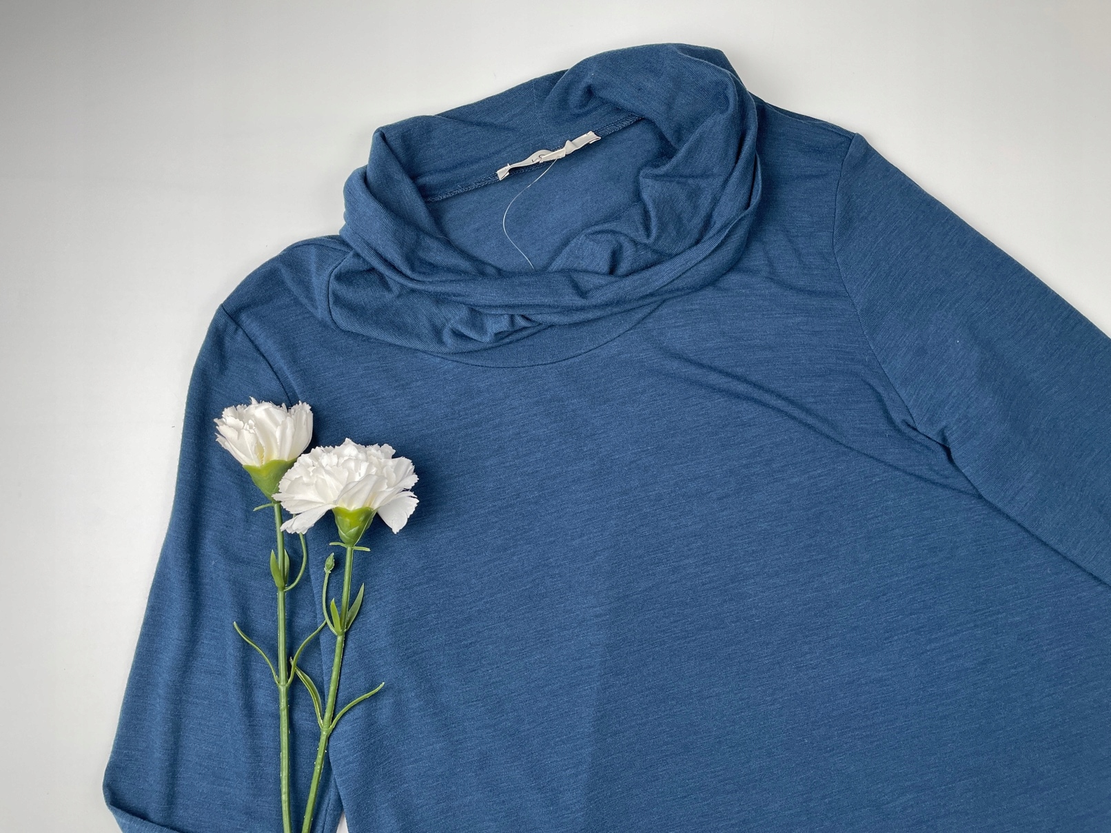 - The Women's Women's Turtleneck. Он в темно -синем цвете, с нежным рисунком Меланжа. Имеет простой, более свободный разрез. Это с длинными рукавами. Golfik обширный, свернут. Он был сделан из приятного на ощупь, более тонкого материала. Это дольше- это также идеально подходит для леггинсов.