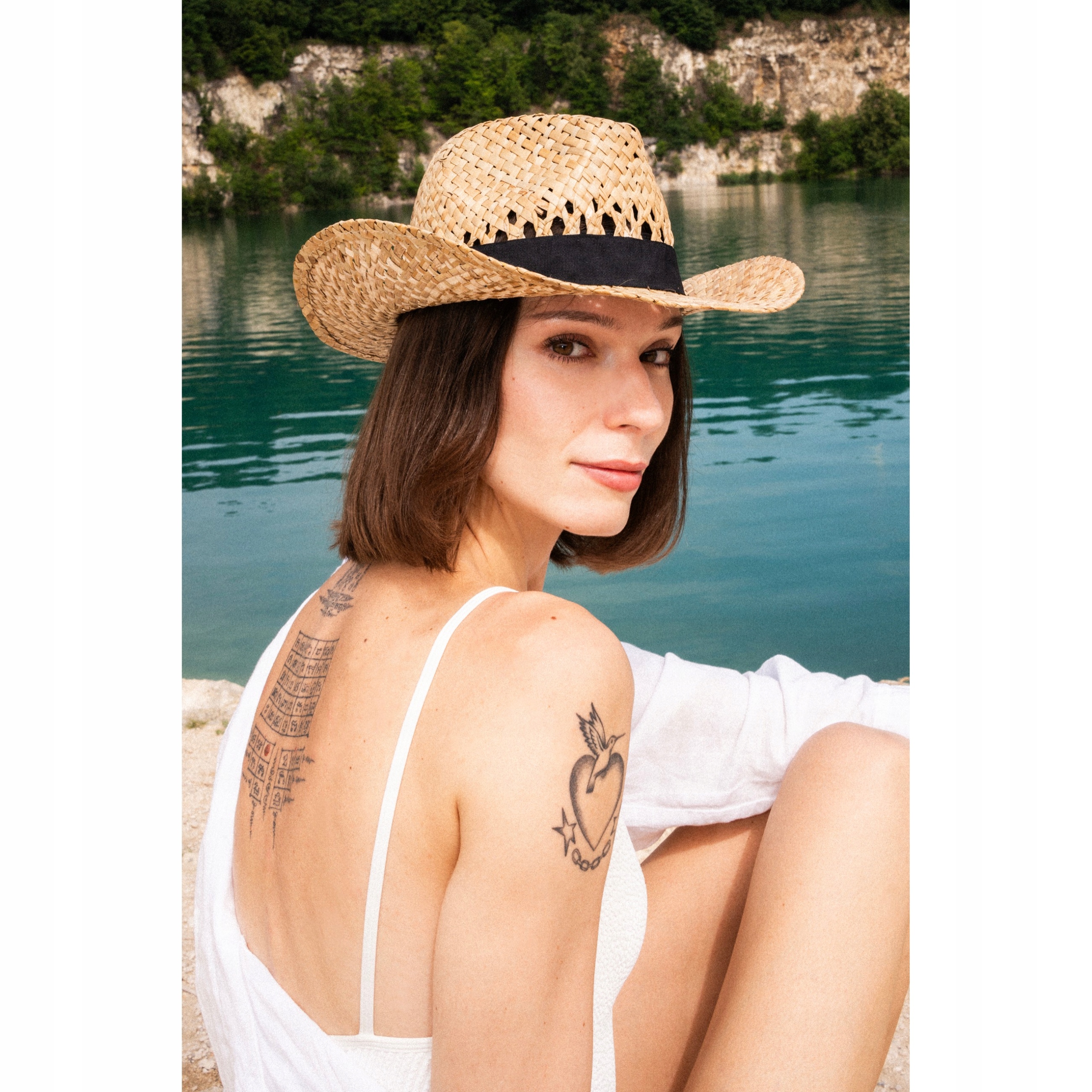 Эта женская ковбойская шляпа - это сочетание классического стиля дикого запада с летней легкостью. Созданный полностью естественной травы , это очень легкий, воздушный и удобный , благодаря которой он отлично работает в жаркие дни.