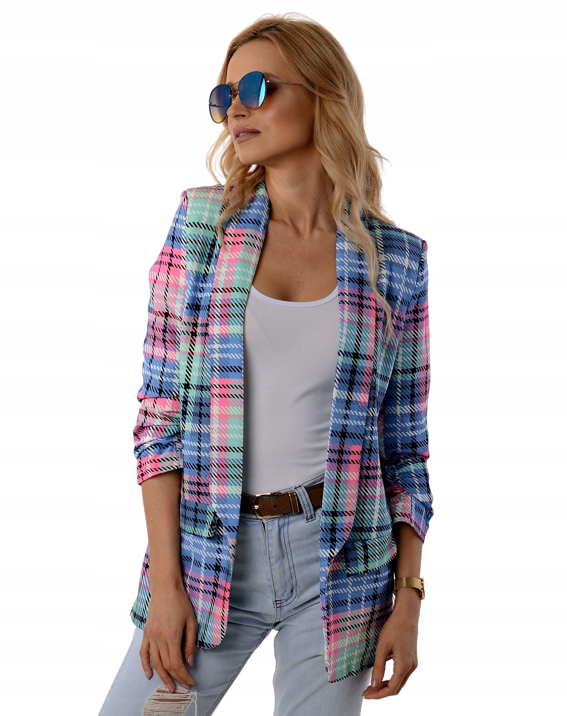 Уникальный, модный, свободный жакет в оригинальную красочную клетку насыщенных цветов. Удлиненная модель, воротник-смокинг. Рукава длиной 3/4 придают оригинальный характер. Два имитационных кармана по бокам с эффектными клапанами украшают куртку. Утягивающий дизайн с подкладкой и мягкими подплечниками. Отличное качество, идеальная отделка!