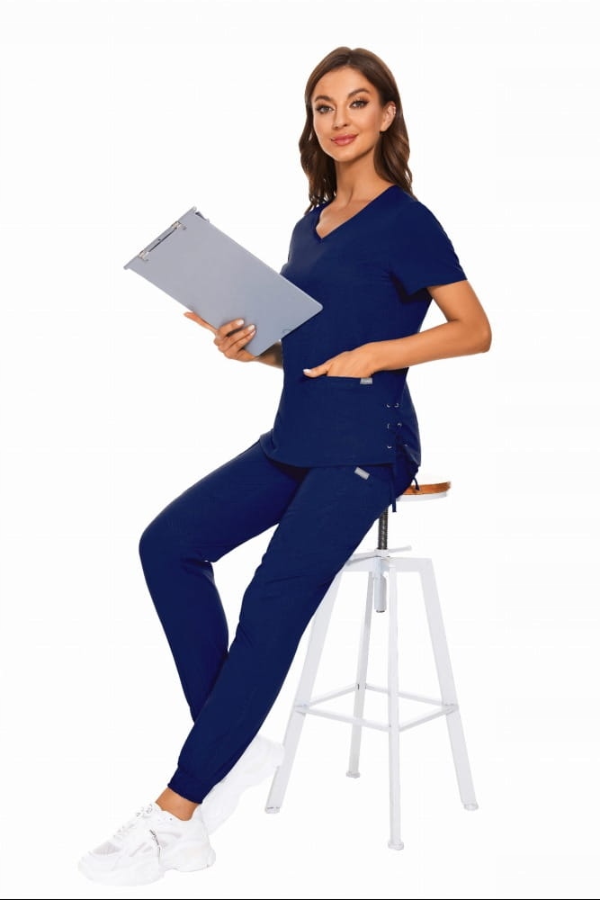 Медицинские брюки имеют среднюю талию и регулируются кулиской на талии.