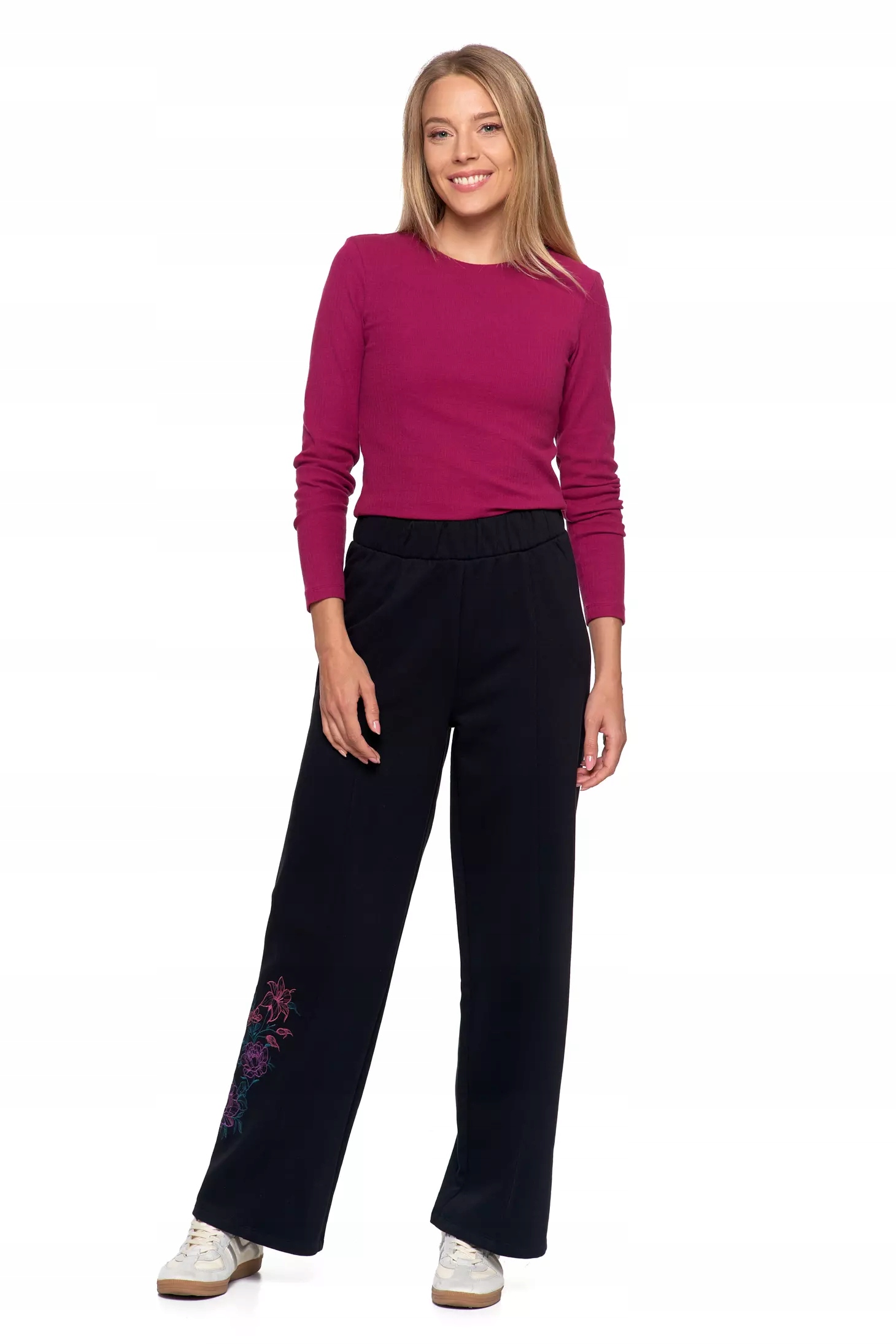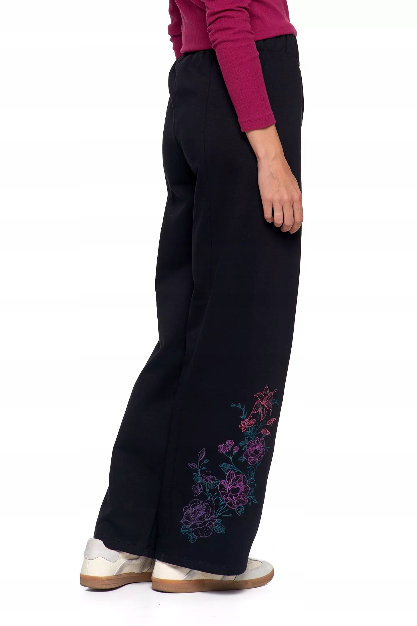 - Покрой: Модный широкий крой (широкие штанины), придающий стильный и повседневный характер.