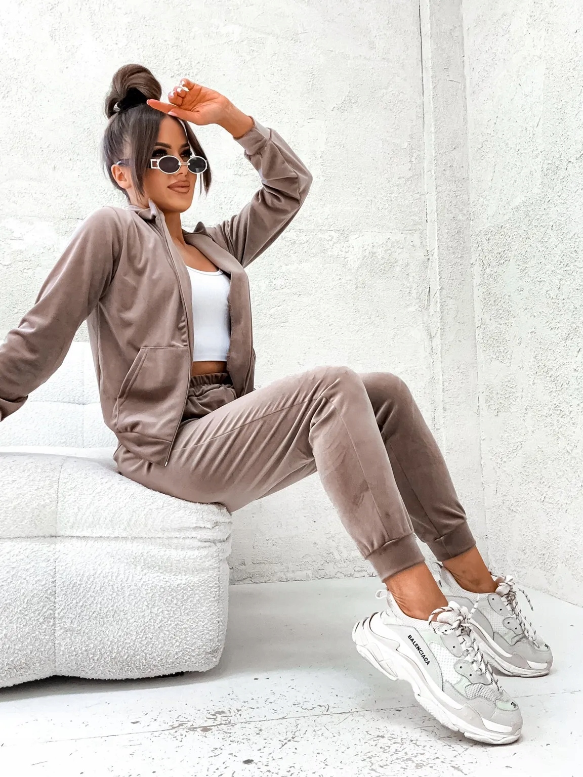 Женский велюровый спортивный костюм от польского производителя. Он состоит из толстовки с длинными рукавами и длинных брюк. Модель – предложение для любителей спортивного стиля. Он обеспечивает полную свободу движений и чрезвычайно приятен к телу. Равномерный свитшот красивого бежевого цвета с длинными рукавами на молнии и карманами для мелочей без капюшона. Комплект дополнен длинными брюками того же цвета с карманами. В пояс вшита удобная резинка. Рукава и штанины отделаны манжетами.