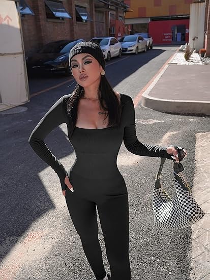 Fashionable design: This women's solid color jumpsuit with square collar and long sleeves. It fits perfectly to the body, emphasizes sexy shapes and lifts the buttocks.