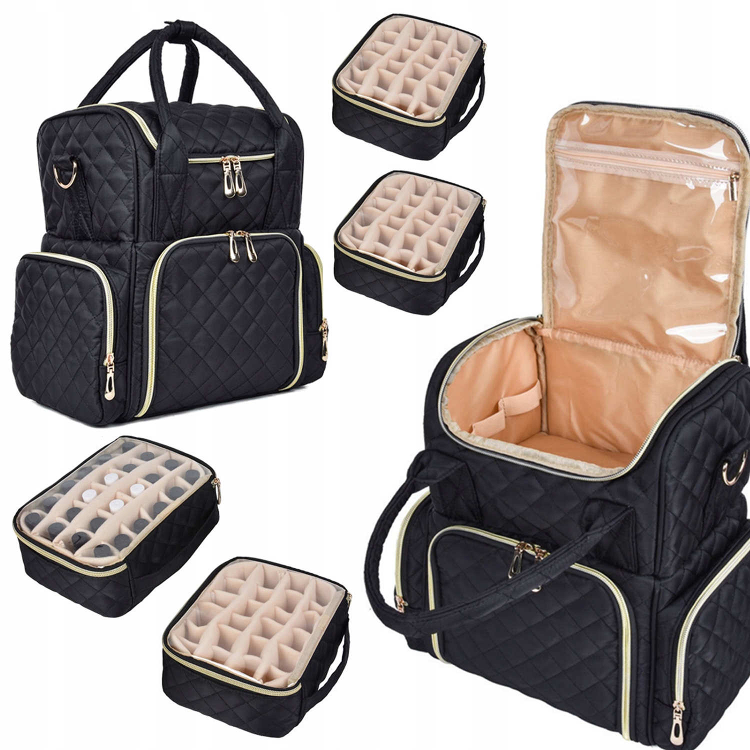 Более низкий уровень: содержит два съемных случая, которые будут держать до 48 бутылок с лаком для ногтей. Ногти, кисти и другие маленькие инструменты.