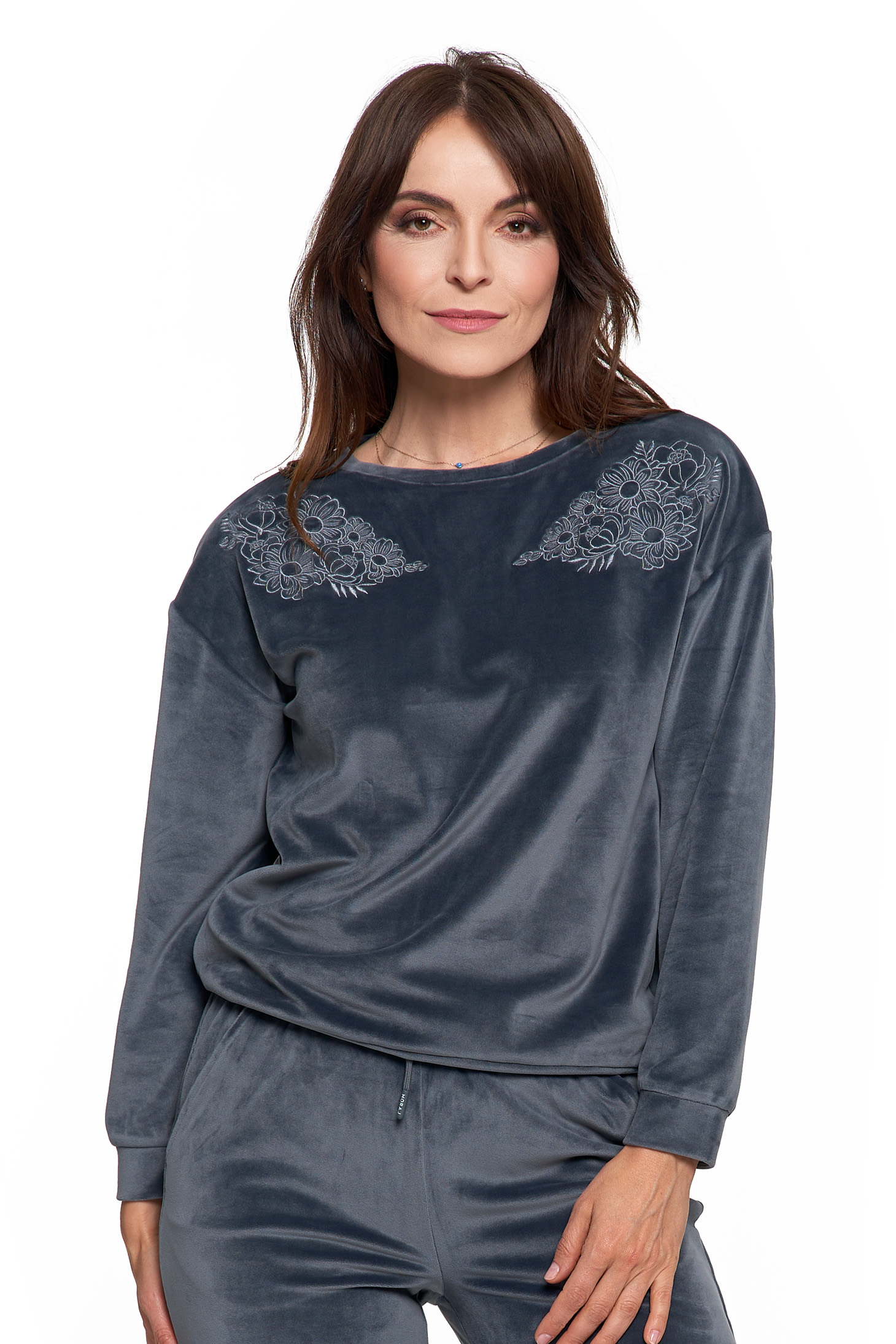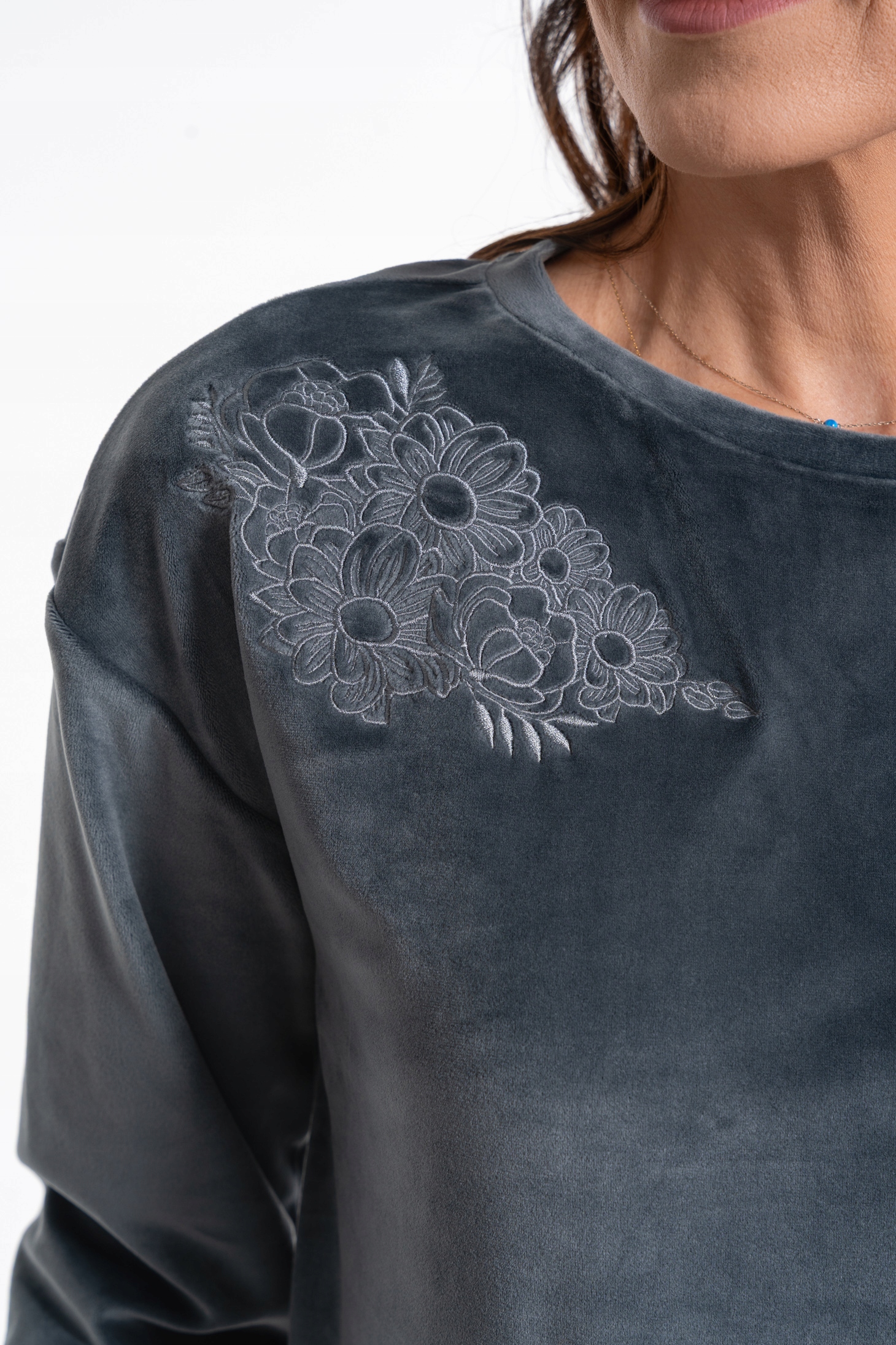 - Деталь: элегантная цветочная вышивка на плечах придает комплекту неповторимый женственный характер.