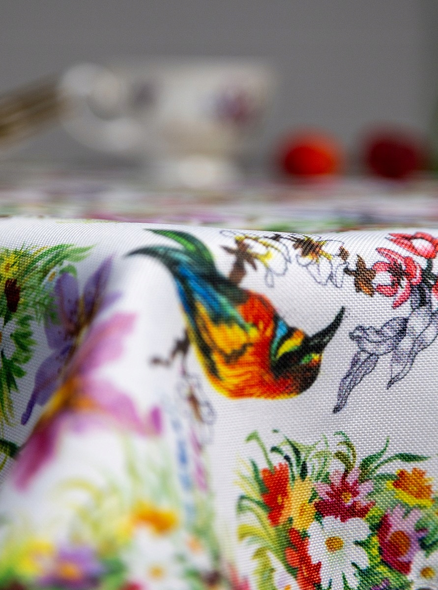толстая матовая скатерть с приличной тканью, напечатанной у одной из самых красочных птиц, найденных в польском ландшафте: Szczygła и żołna. Красочное оперение идеально гармонирует с богатством природы и дает скатерти по -настоящему экзотический характер.