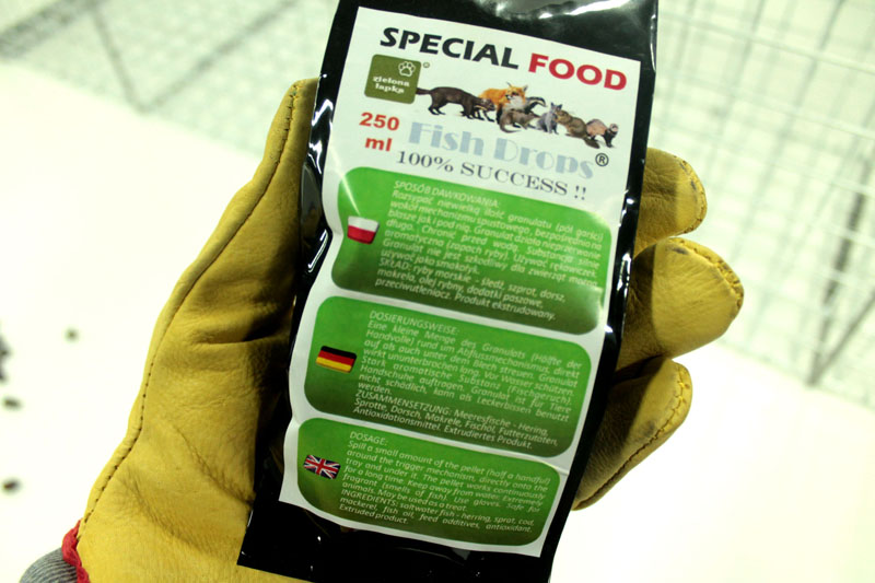 Мы добавляем в ловушку специальную приманку SPECIAL FOOD Fisch Drops, разработанную и производимую компанией, специализирующейся на производстве приманок и пищевых экстрактов для животных. Его запах настолько характерен и интенсивен, что даже при упаковке сотрудники надевают маски и толстые перчатки.