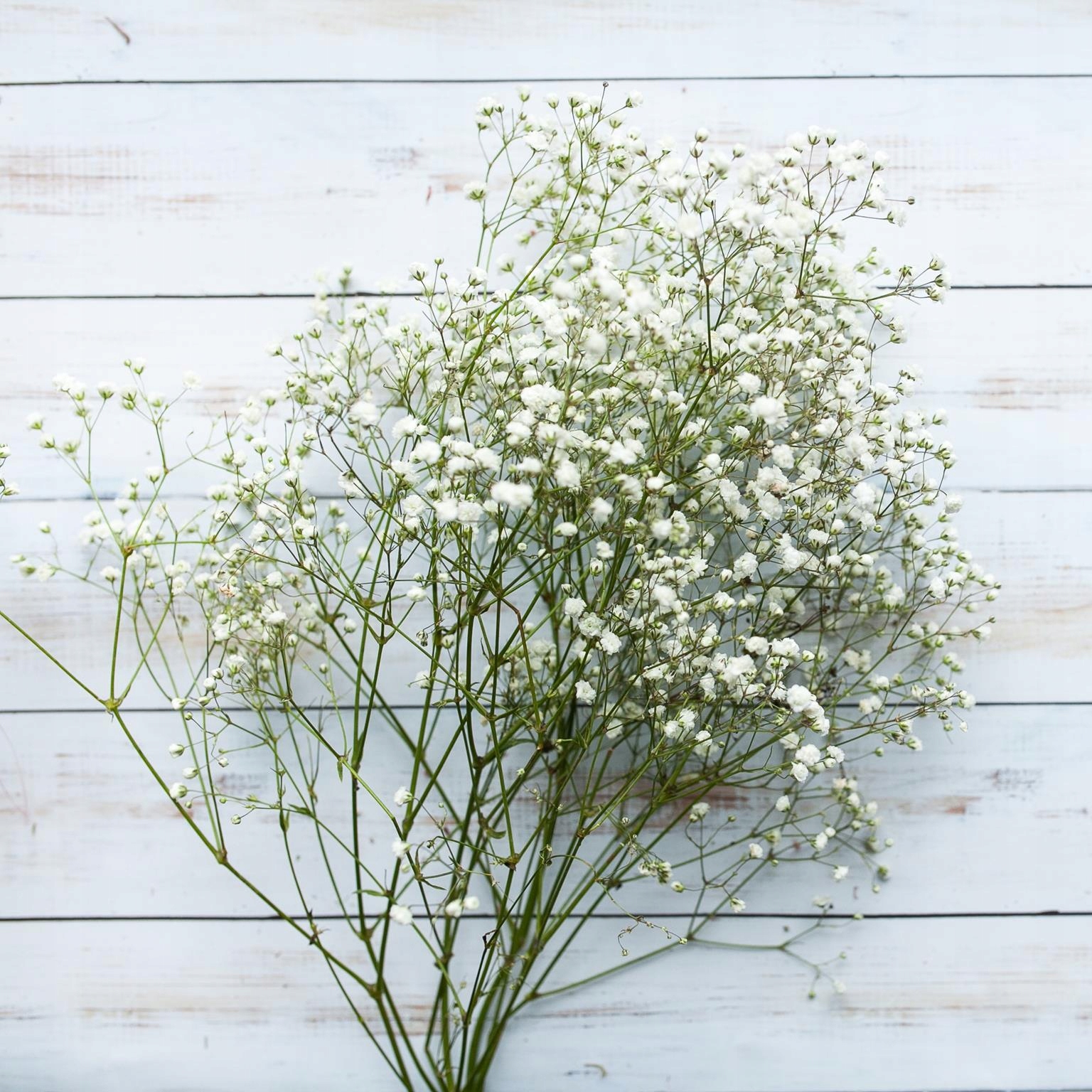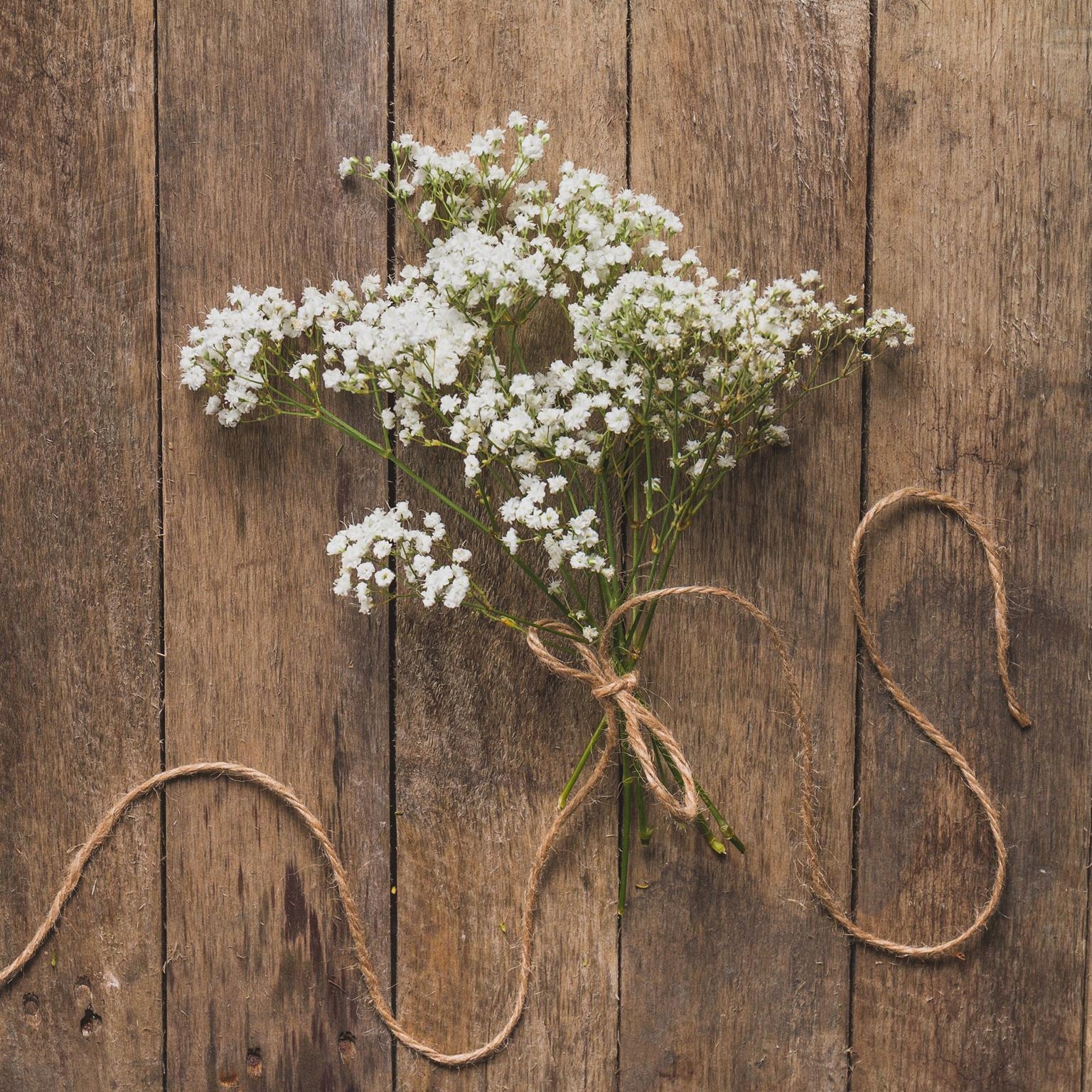 Элегантный букет живых цветов гипсофилы, упакованный в экологическую декоративную бумагу и ленту.