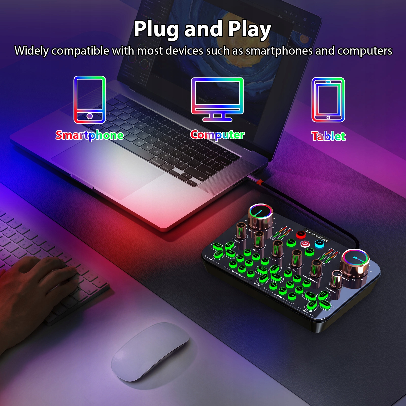 2. 【Универсальные функции звуковой карты】: оснащено различными функциями звуковой карты, это устройство позволяет регулировать высокие, средние и низкие тона; Уровни сопровождения, реверберации и регистрации; и объем микрофона. Он также содержит 9 функциональных клавиш, 8 клавиш звукового эффекта и 16 клавиш специального эффекта, предлагая широкий спектр параметров регулировки звука.