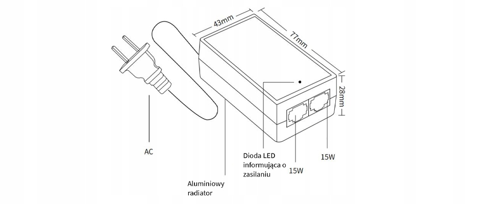 Источник питания PoE используется для питания устройств, использующих стандарт PoE и IP-связь. Источник питания подает питание PoE в кабель Ethernet, а затем оно передается на камеру или другое устройство — приемник. Это так называемый «PoE-инжектор». В результате камера получает питание и данные по одному и тому же кабелю. Блок питания поддерживает подачу питания на два порта RJ45, что означает, что блок питания может работать как двухпортовый коммутатор PoE.
