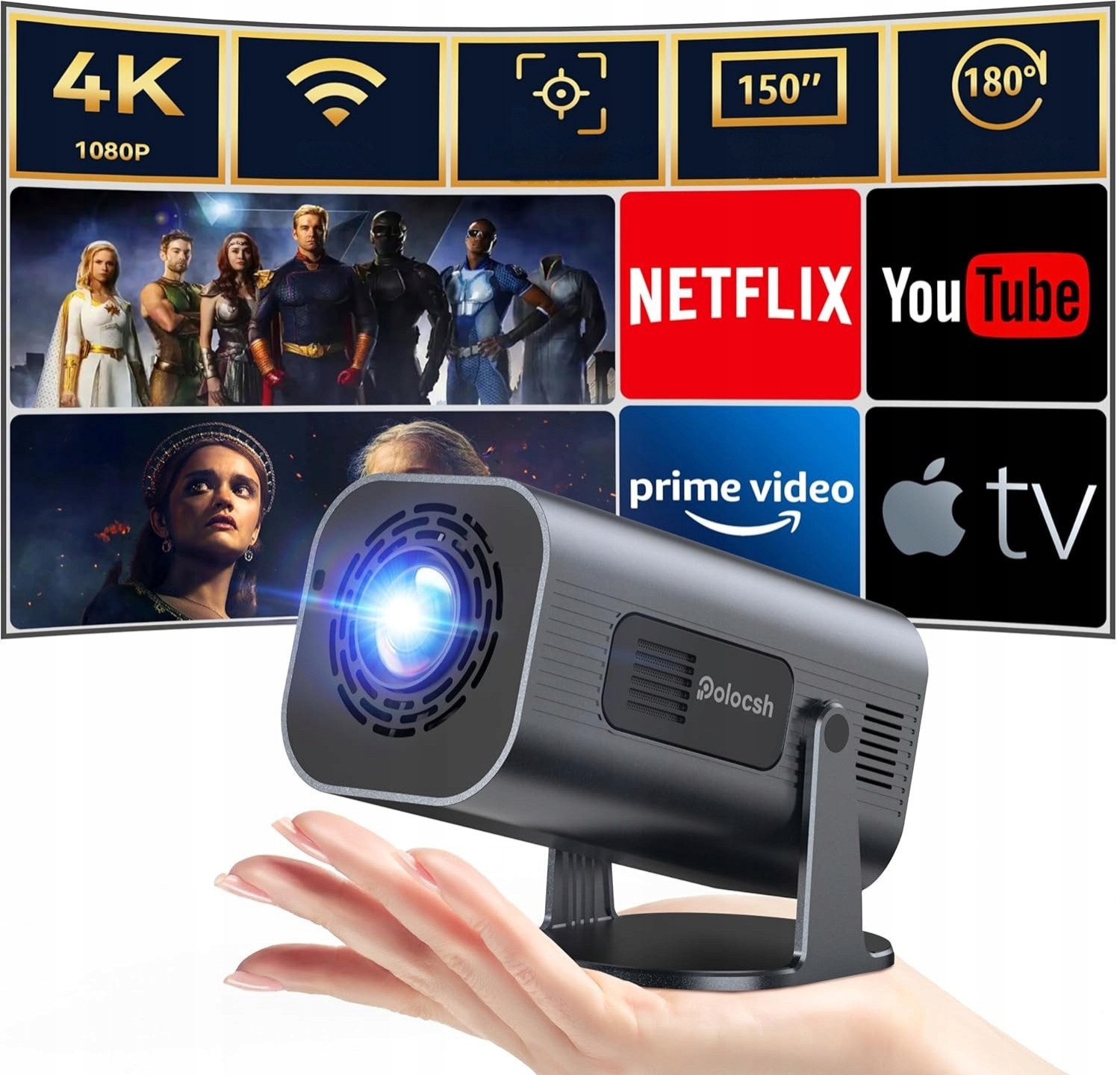 Проектор Polocsh Mini, домашний кинотеатр 4K Full HD 1080p, проектор с Android TV 11.0, встроенным WLAN 6 и BT5.2, 150-дюймовый экран, поддержка поворота на 180 градусов