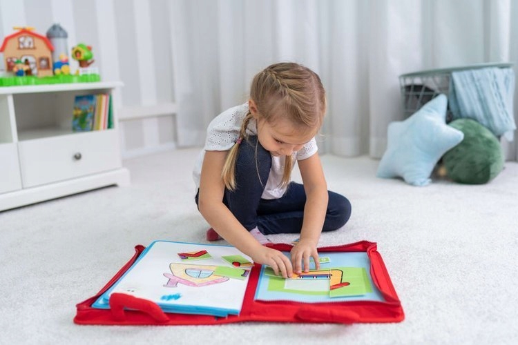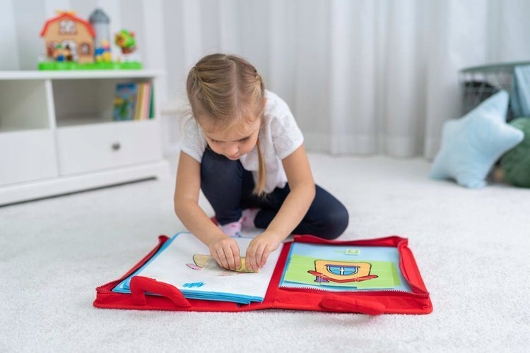 На одной стороне книжки расположены пазлы на липучках, создающие картинку, на другой стороне пустое место для рисования.