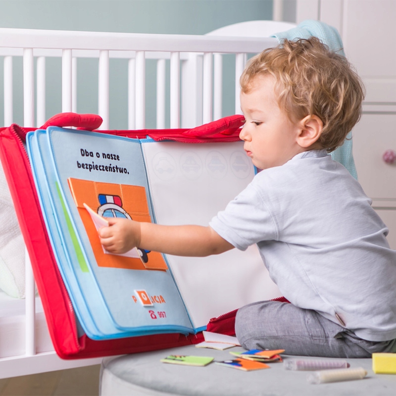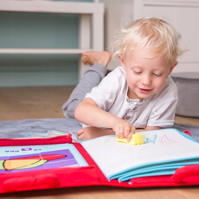 Эта книга предоставит вашему ребенку пространство для рисования, шаг за шагом проведя его через процесс создания рисунка. На одной стороне книги пазлы на липучках, создающие картинку, на другой стороне пустое место для рисования. Чтобы облегчить детям задачу, вверху каждой пустой страницы есть иллюстрированная инструкция, как создать рисунок, видимый на соседнем пазле. В комплект книги входят специальные мелки и волшебные губки, которые, намокнув, сотрут ранее нарисованную работу, и веселье можно будет начать заново. Каждая картинка-загадка описана названием видимого на ней предмета или транспортного средства. Все дополняется удобными ручками и практичной молнией, позволяющей застегивать книгу.