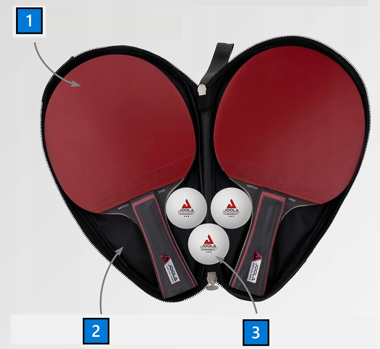 Набор для настольного тенниса JOOLA DUO PRO, состоящий из две ракетки для настольного тенниса JOOLA MATCH PRO, три мяча для настольного тенниса JOOLA Tournament и практичный чехол для хранения всех элементов — он идеально подходит для игроков, у которых всегда готово снаряжение для состязания с соперниками.