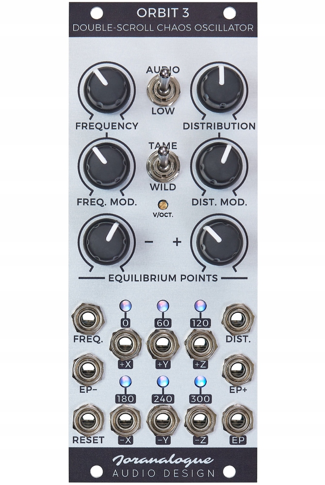 Орбита 3 — это аналоговый хаотический/бистабильный осциллятор, основанный на трехосной модели странного аттрактора. Модуль можно использовать в качестве источника звука или источника модуляции, демонстрируя апериодическое динамическое поведение.