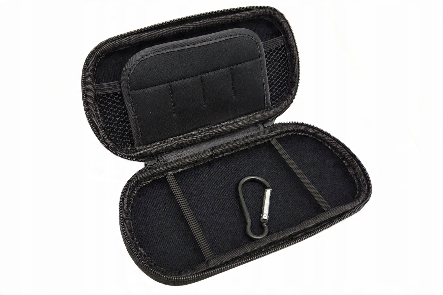 Чехол закрывается на молнию, внутри есть кармашек для игровых карточек или других мелких предметов. Экран консоли защищен от царапин тканевой перегородкой. В чехле имеется металлическая петелька для крепления карабина и карабина. Консоль удерживается резиновыми ремнями.