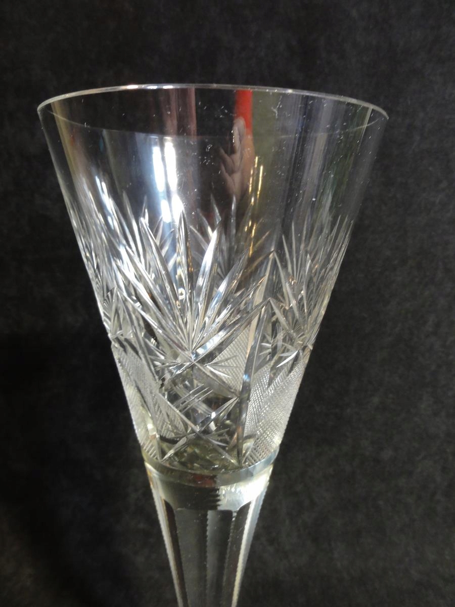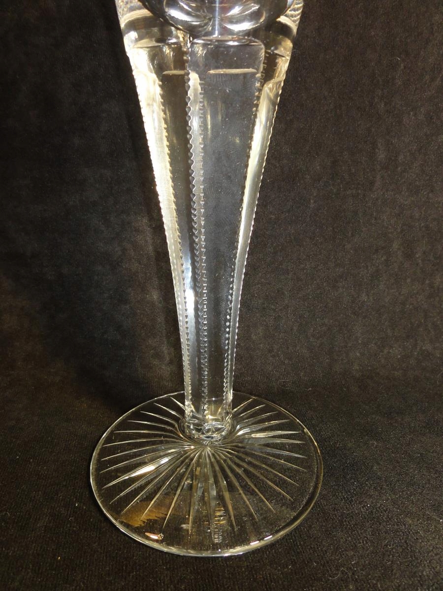*чаша из бесцветного стекла, выдутая в форме, шлифованный стержень, чаша с 9 пузырьками воздуха у основания, точно отшлифованная на брюхе, ножке с розеткой,