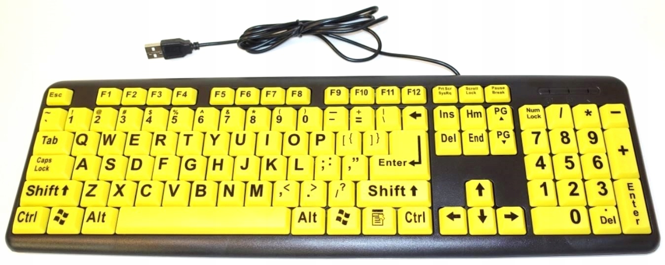 клавиатура, предназначенная для визуально -нарушения. Маркировка на клавиатуре намного больше, чем на стандартной клавиатуре. В предлагаемой клавиатуре есть желтые ключи с черными, утолщенными и увеличенными маркировками.
