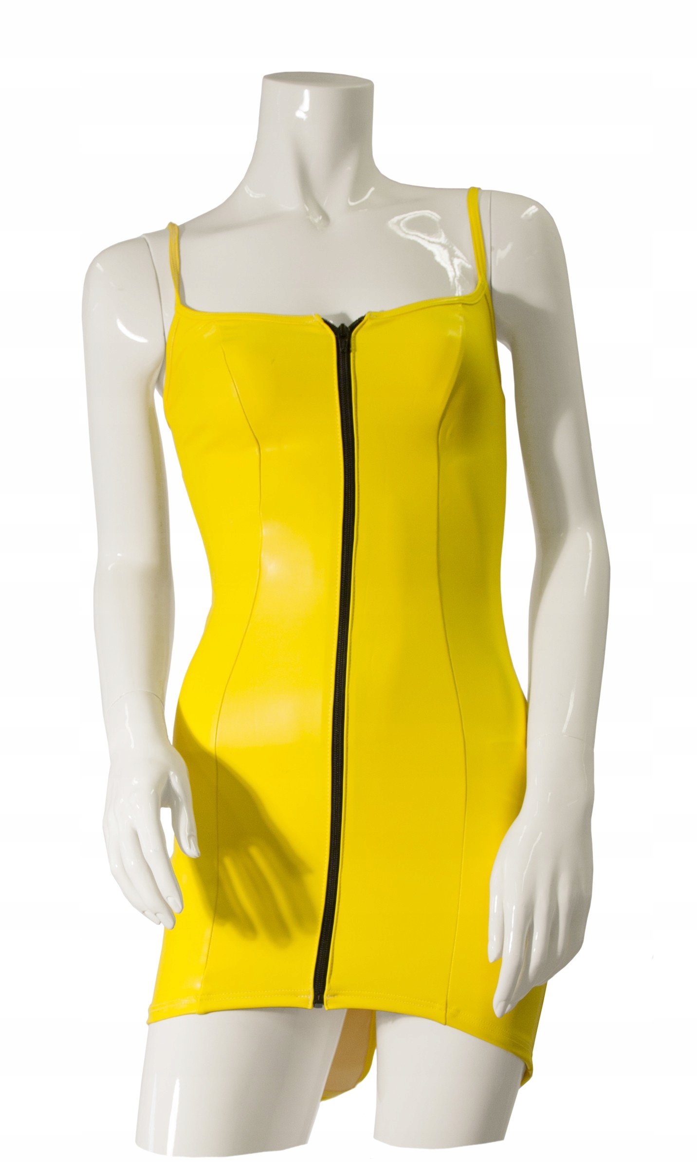 Желтое платье из латекса, внутри мягкая подкладка из эластичной ткани, благодаря чему материал не прилипает к коже и платье легко надевается без применения специализированных порошков и масел.