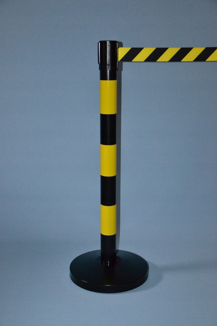 Предлагаем столбы промышленных барьеров желто-черные (черные стойки с порошковым напылением и наклеенными 3-мя желтыми полосами) с желто-черной сигнальной лентой длиной 4 м - длина ленты плавно регулируется с помощью автоподматывающего механизма.